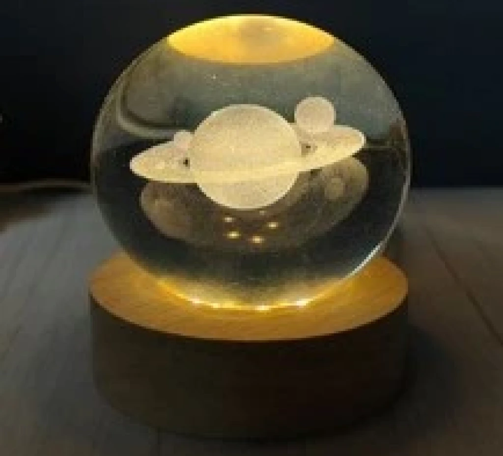 Dekoratif Satürn Tasarımlı Ahşap Altlıklı Işıklı Cam küre Cam:6cm Ahşap:2cm