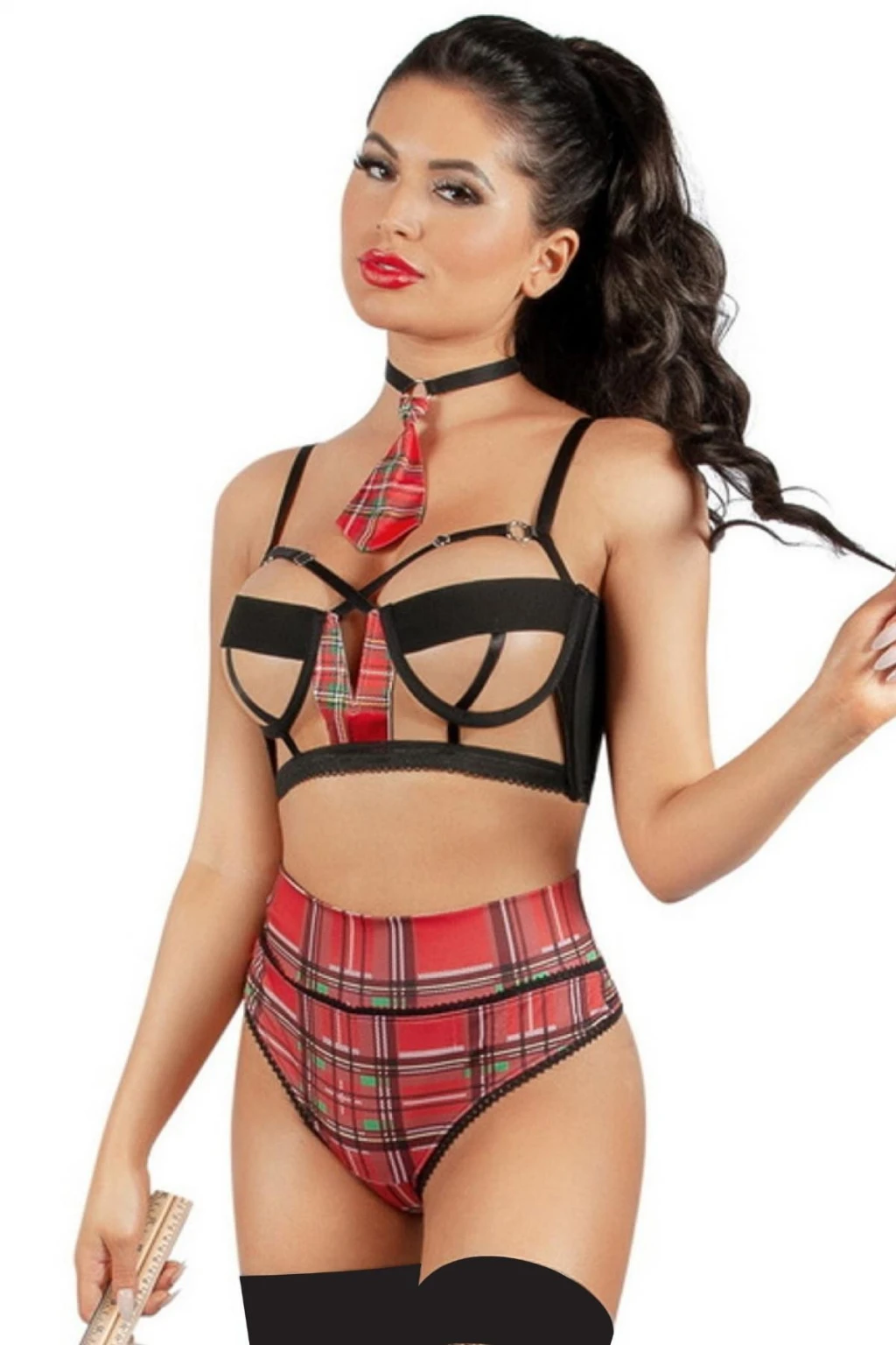 Transparan Siyah-kırmızı Fantezi Bacak Bantlı Sütyen Külot Takımı