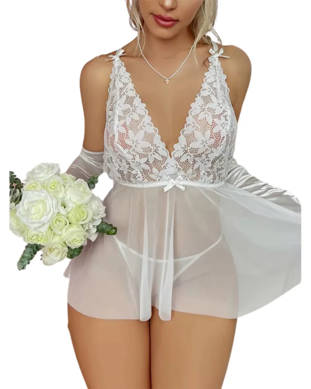 Ürünün Üst Kısmı Dantelden Alt Kısmı Transparan Tül Kumaştan Üretilmiş olup 2 parçadır. 1 adet Elbise 1 adet String. Ürünün Üst Kısmında Kullanılan Dantelin Deseni Değişiklik Gösterebilir. Bu görsellerde yer alan ürün, dantelli ve transparan elbise olarak tasarlanmış fantezi bir gecelik modeldir. Ürün, şık ve çekici bir yapıya sahip olup özel anlar için oldukça ideal bir seçimdir. Ürün Özellikleri Kumaş Transparan Tül : Hafif ve ince yapısı ile vücut hatlarını zarif bir şekilde ortaya çıkarır. Çiçek Desenli Dantel : Göğüs kısmında kullanılan detaylı dantel, şıklık ve romantik bir hava katarı. Beden Seçenekleri Esnek kumaşı sayesinde S, M, L ve XL bedenleri içeren seçeneklere sahiptir. Kullanım Alanları Özel Geceler : Özel günlerde ve romantik anlarda tercih edilebilir. Hediye : Sevgililer günü, doğum günü veya yıl dönümü gibi özel günlerde hediye olarak mevcuttur.