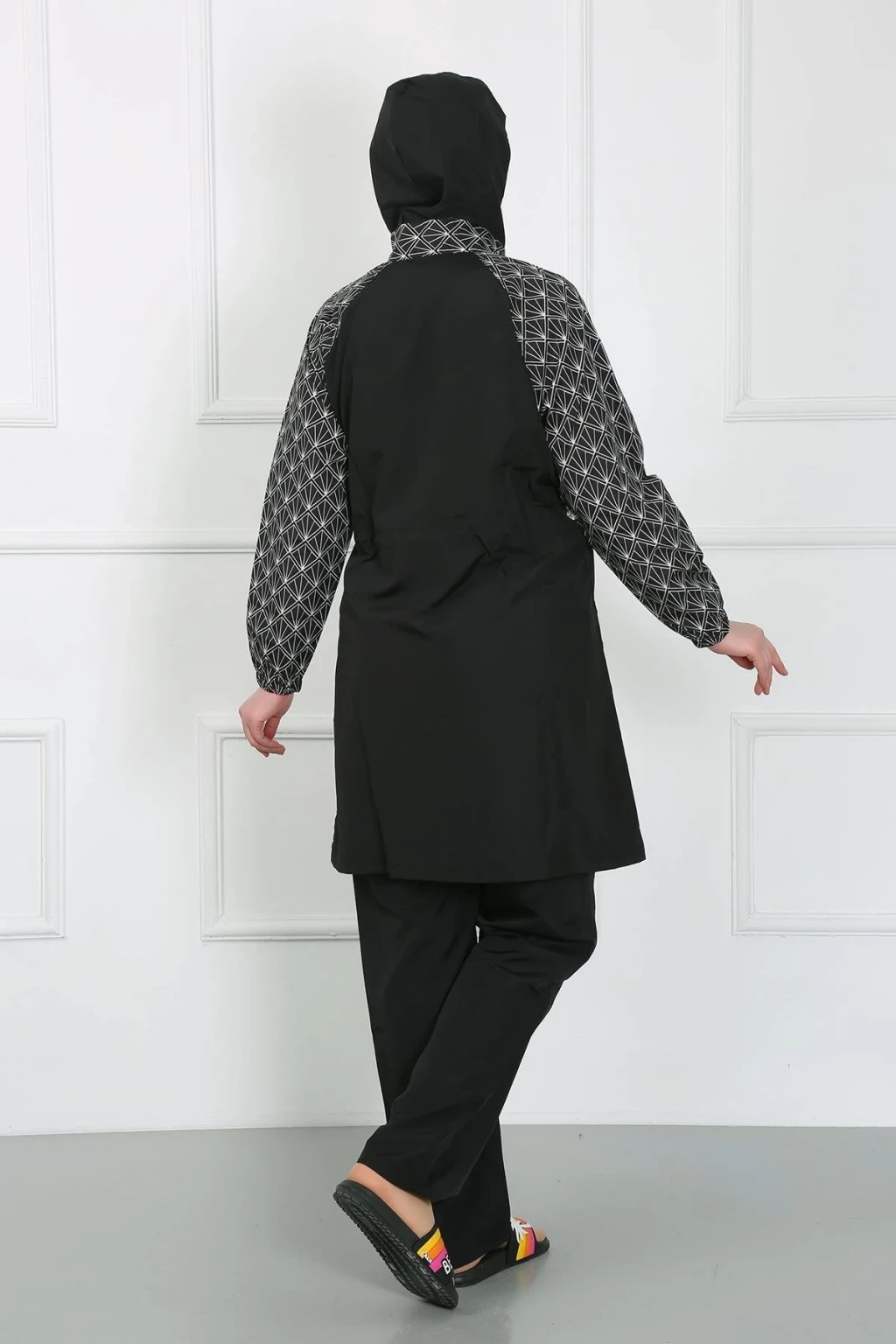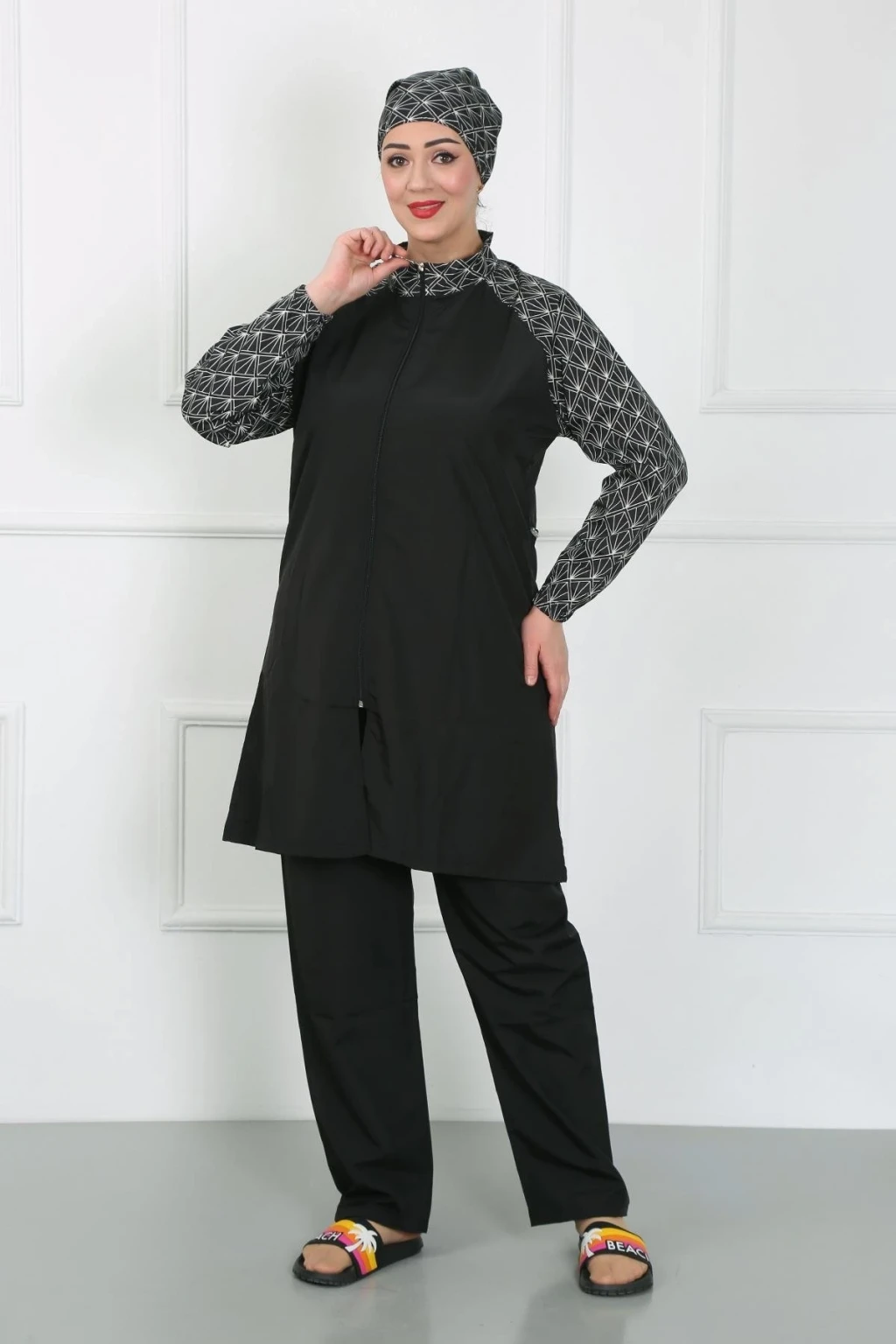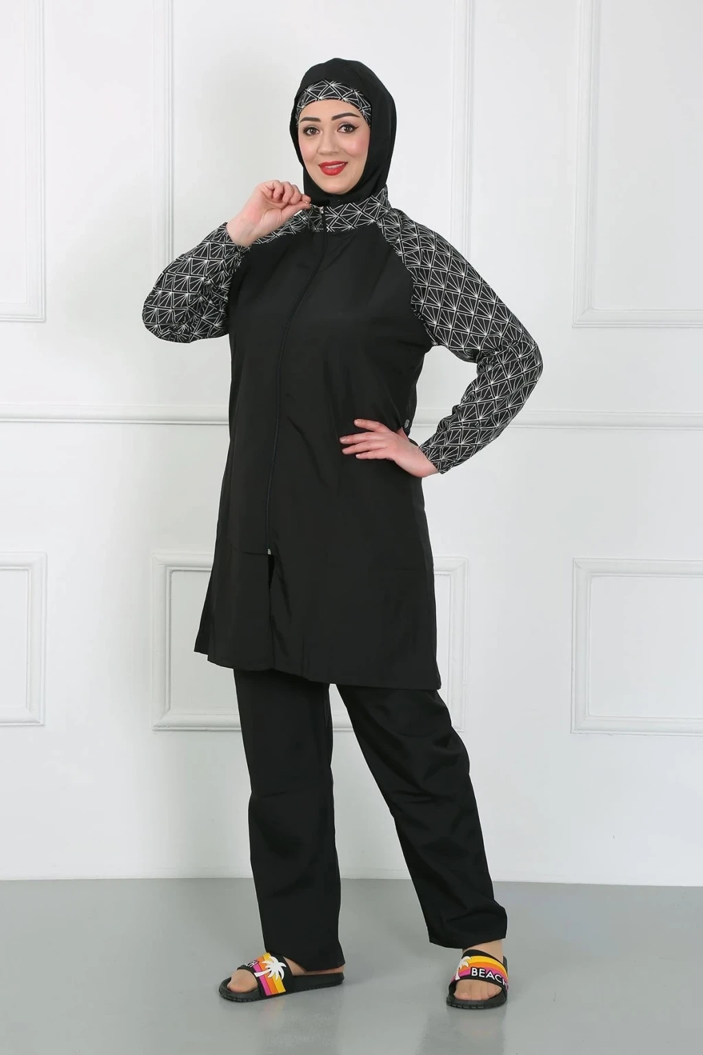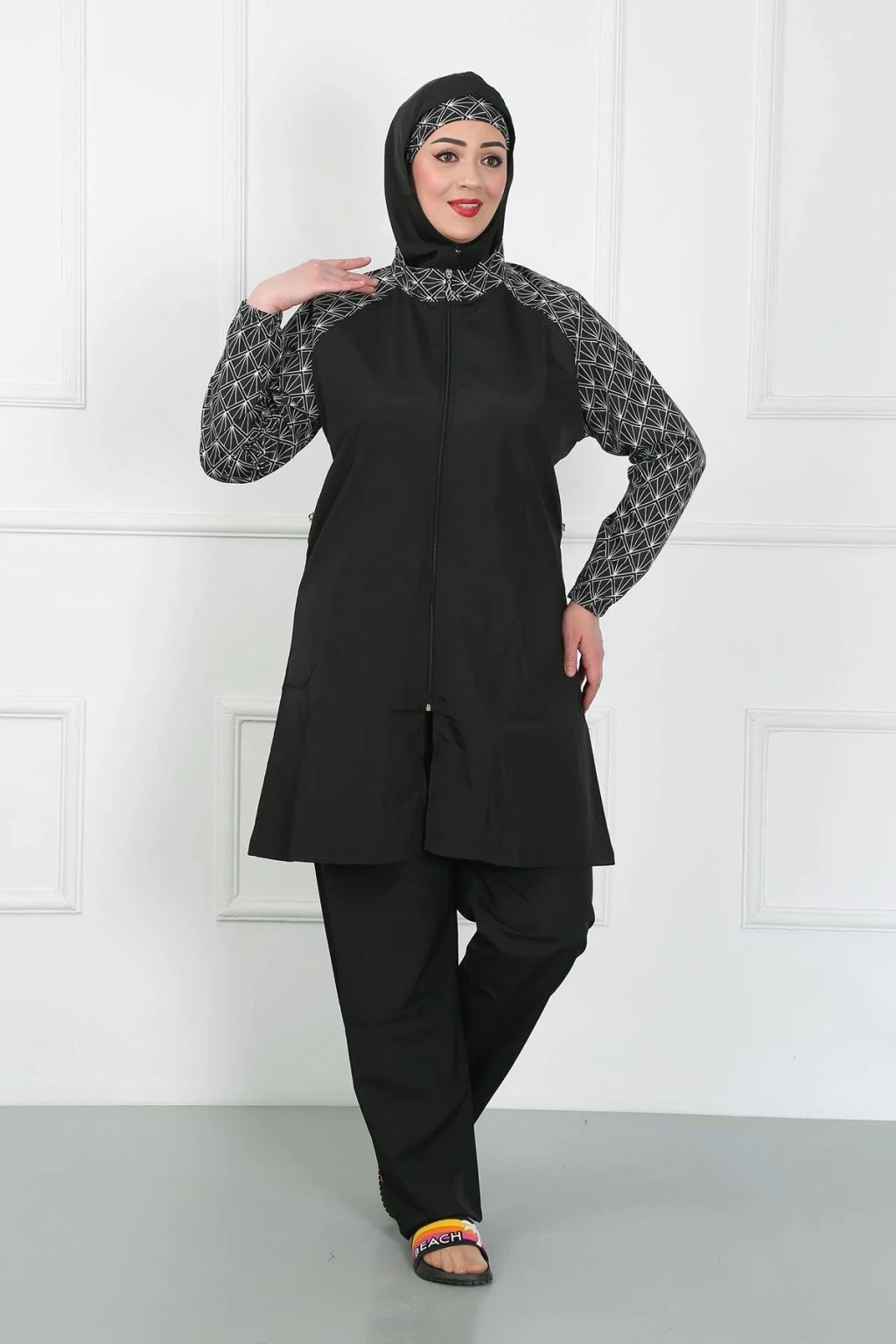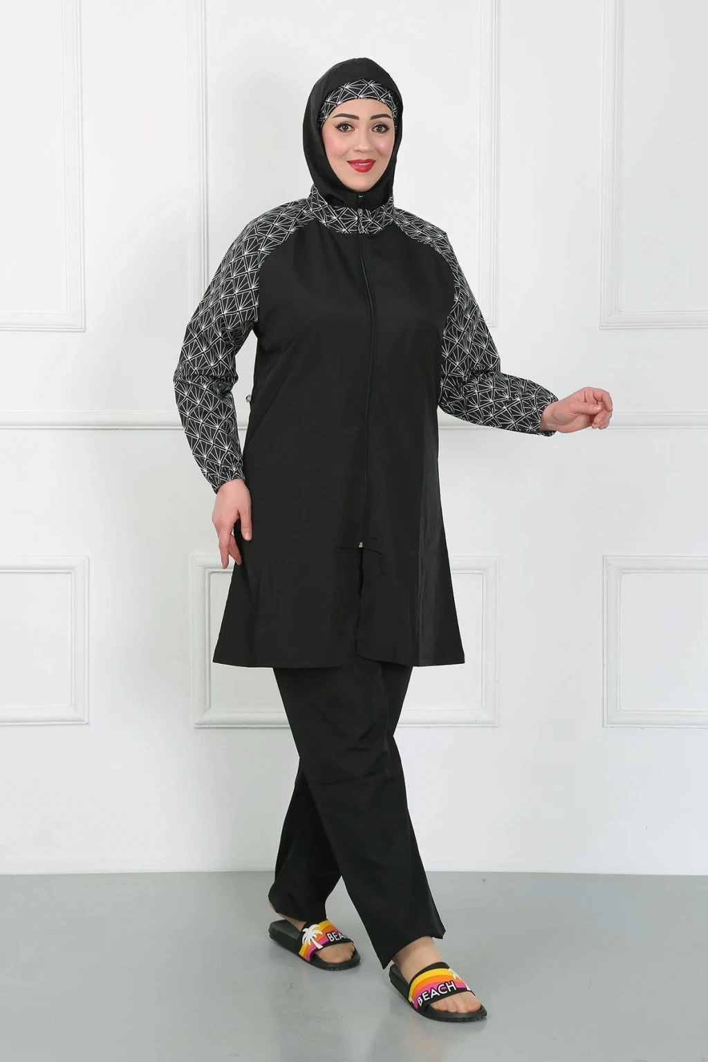 Giyim Büyük Beden Desenli Tesettür Mayo Siyah