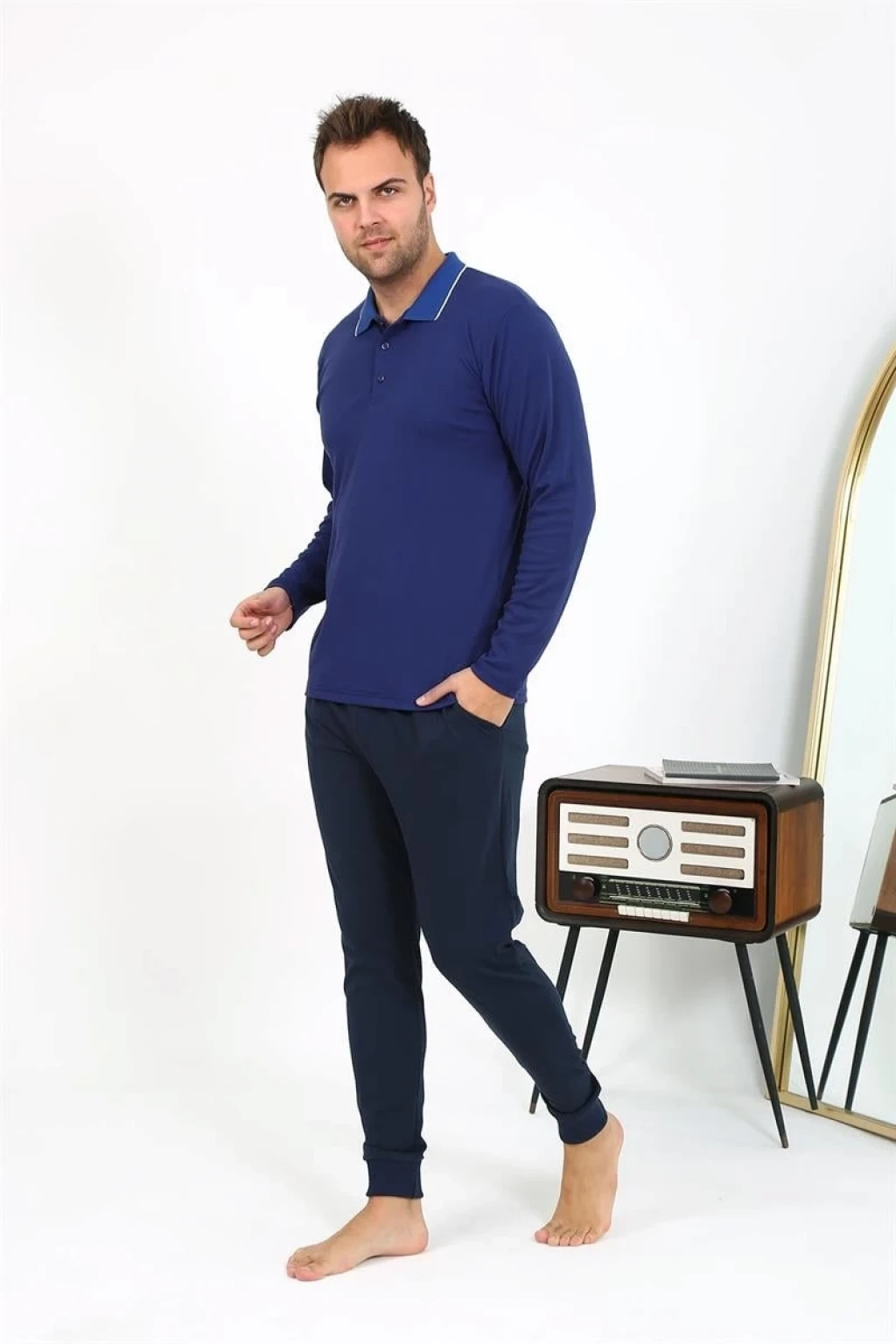 Giyim Erkek Polo Yaka Uzun Kol Penye Pijama Takımı Lacivert