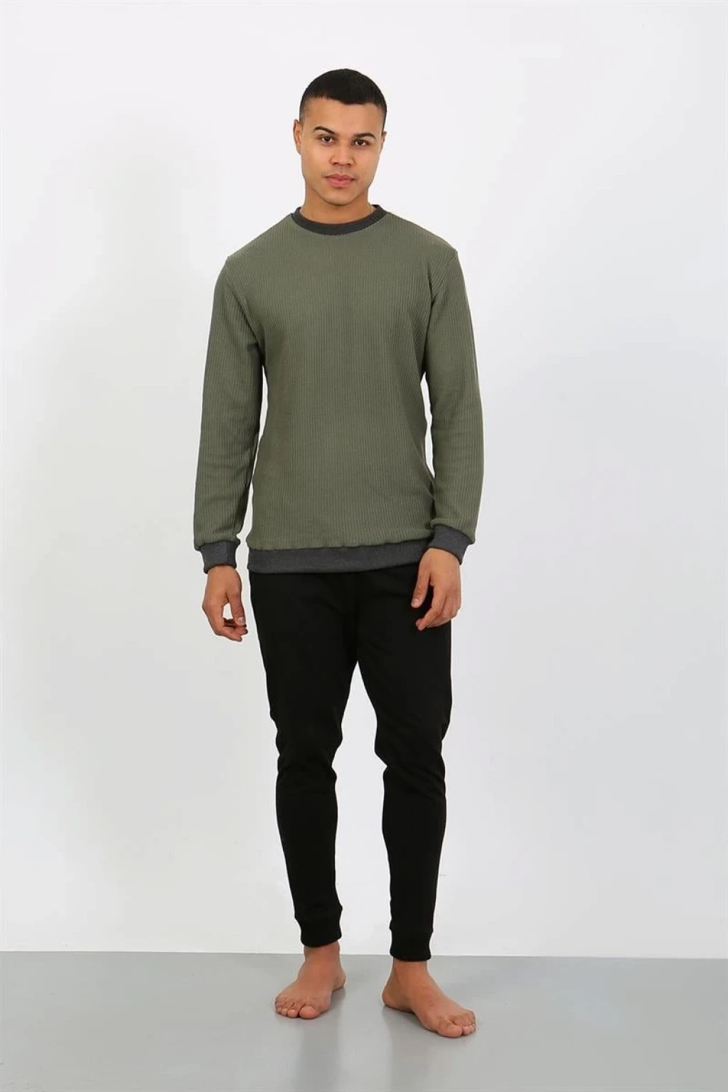 Çamaşır Kenti markasının şıklığı ve rahatlığı bir araya getirdiği Erkek Uzun Kol Manşetli Paça Penye Pijama Takımı Haki, gecelerinize konfor katacak.