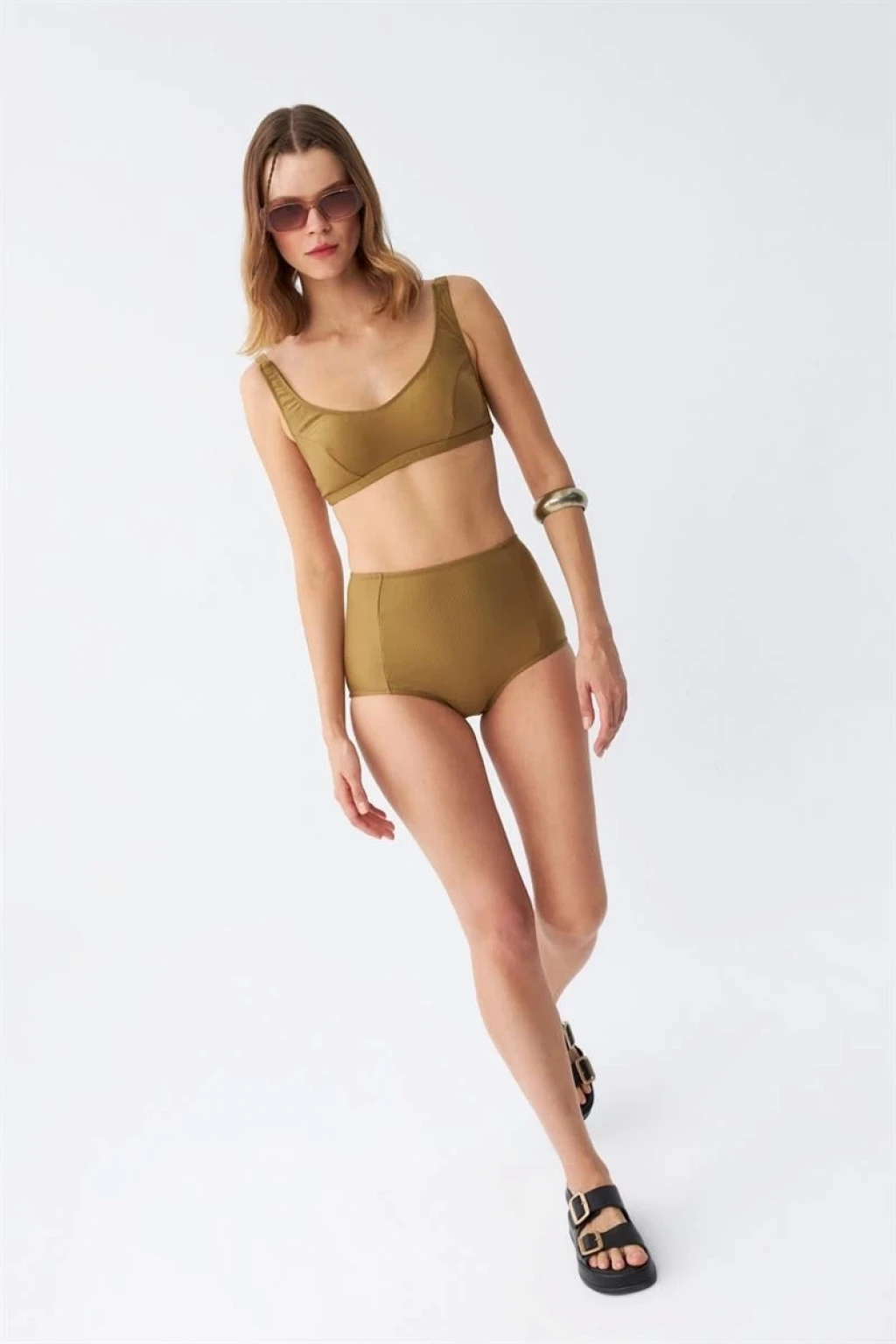 Yaz aylarının vazgeçilmezi olmaya aday Kadın Basic Hardal Pedli Yüksek Bel Bikini Takımı, plaj kombinlerinizi tamamlayacak.