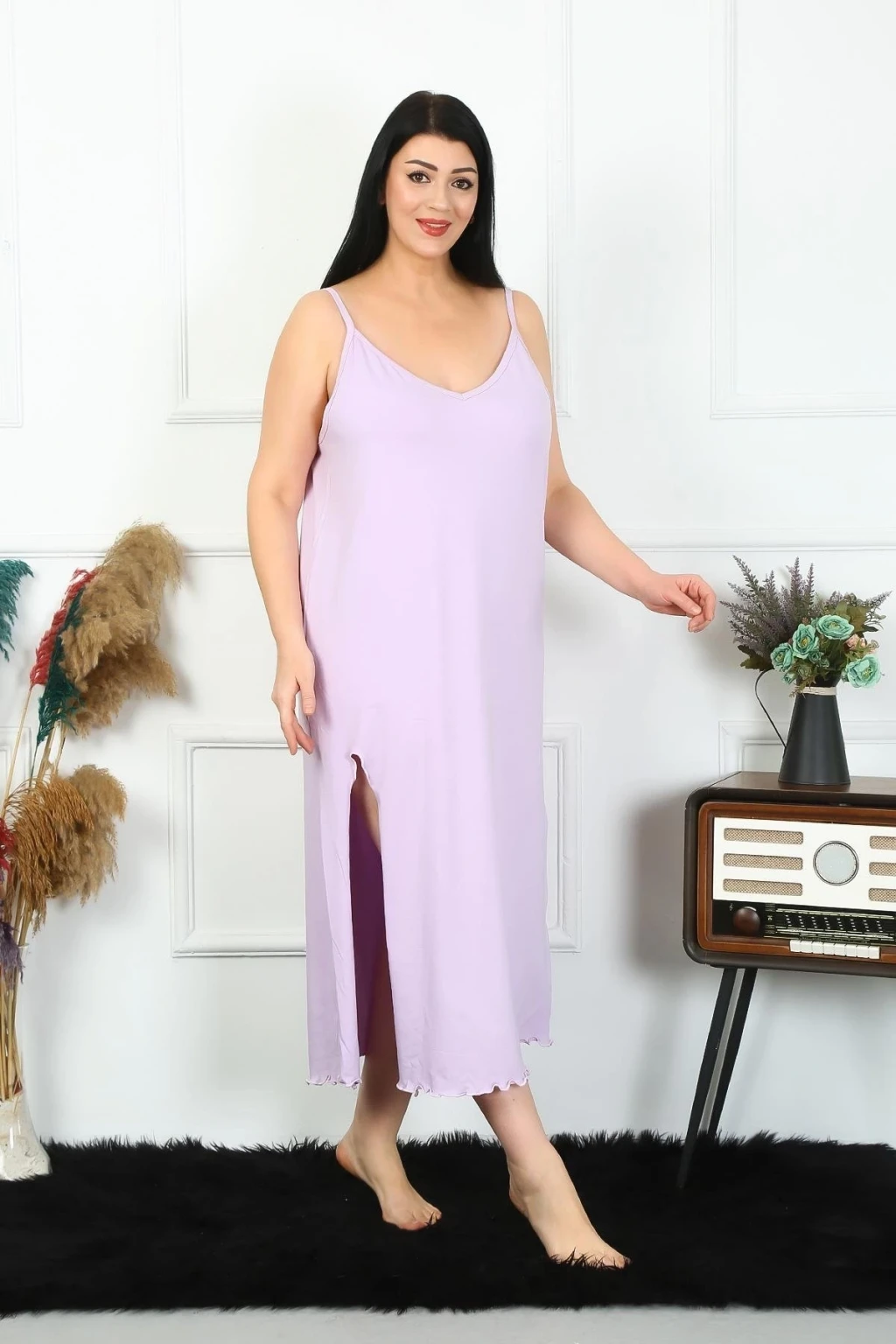 Çamaşır Kenti Kadın Büyük Beden İp Askılı Pamuklu Lila Uzun Gecelik, rahatlığı ve şıklığı bir arada sunar.