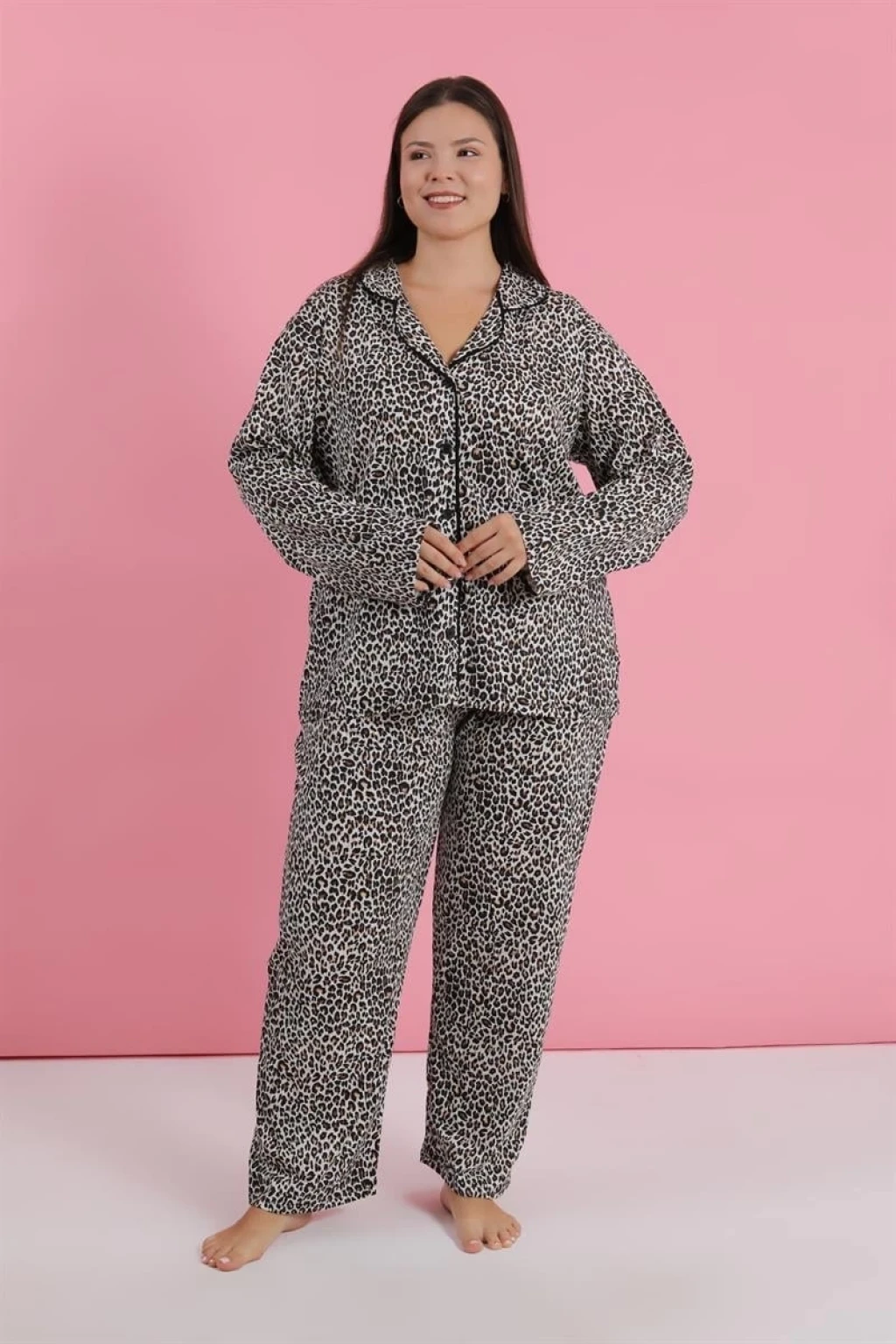Çamaşır Kenti Kadın Büyük Beden Leopar Desenli Düğmeli Pijama Takımı, rahatlığı ve şıklığı bir arada sunar.