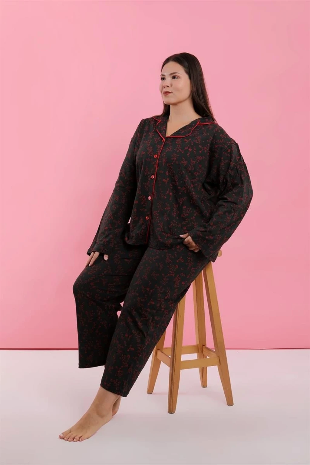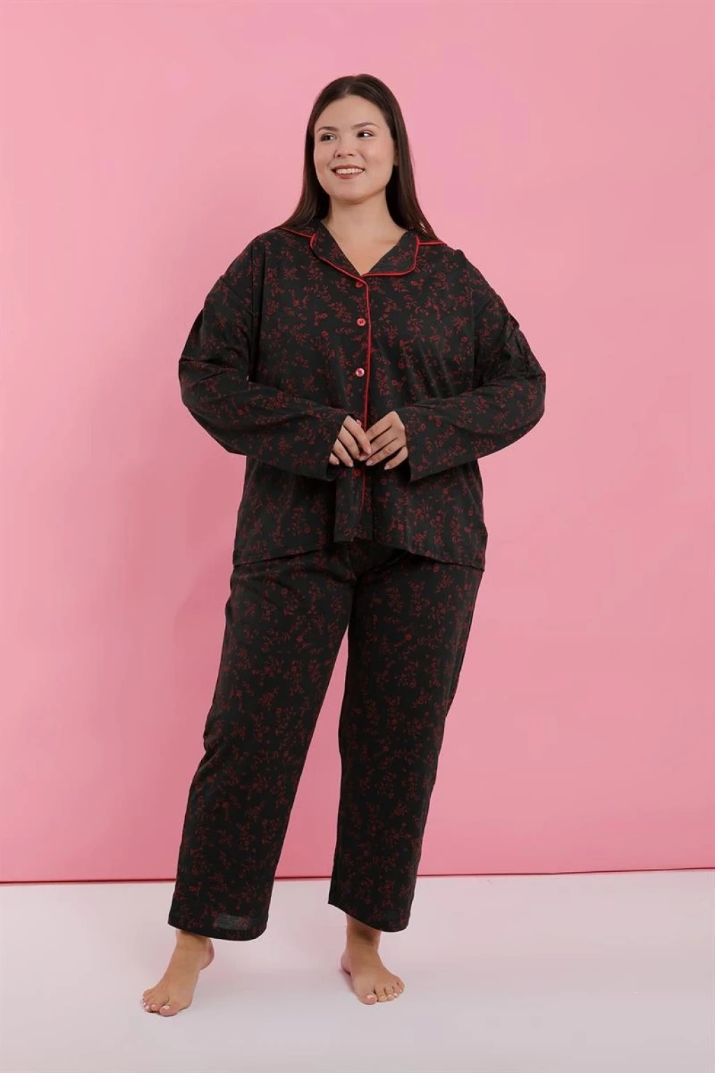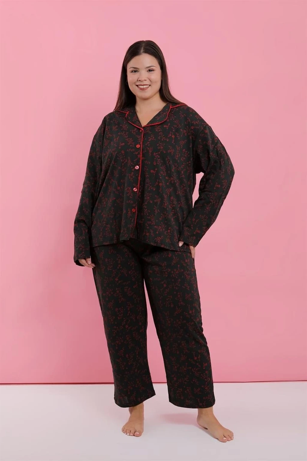 Çamaşır Kenti markasının tasarladığı Kadın Büyük Beden Siyah Kırmızı Çiçekli Düğmeli Pijama Takımı, konfor ve şıklığı bir arada sunuyor.