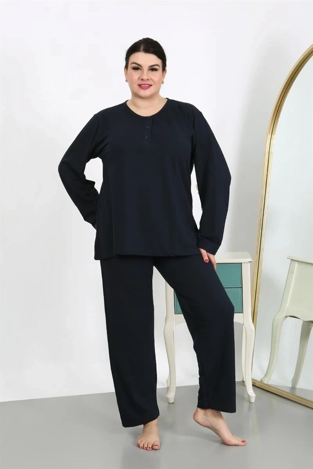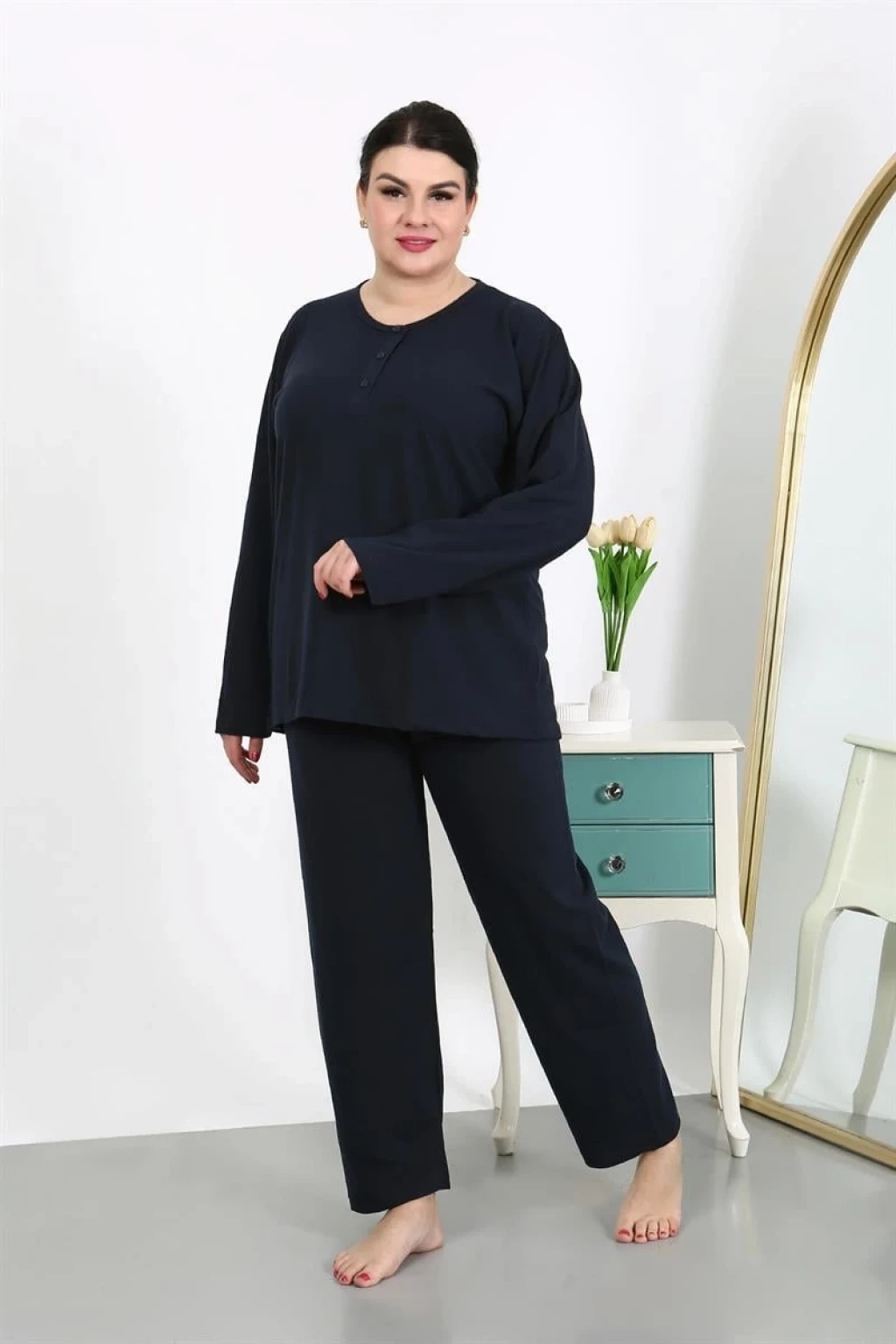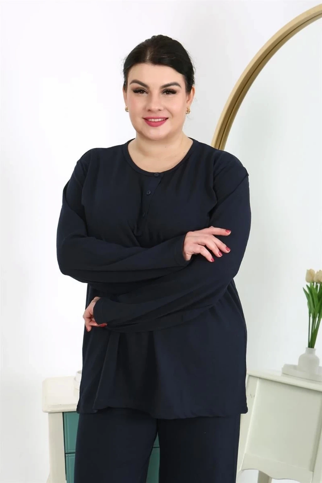 Giyim Kadın Büyük Beden Uzun Kol Penye Pijama Takımı Lacivert