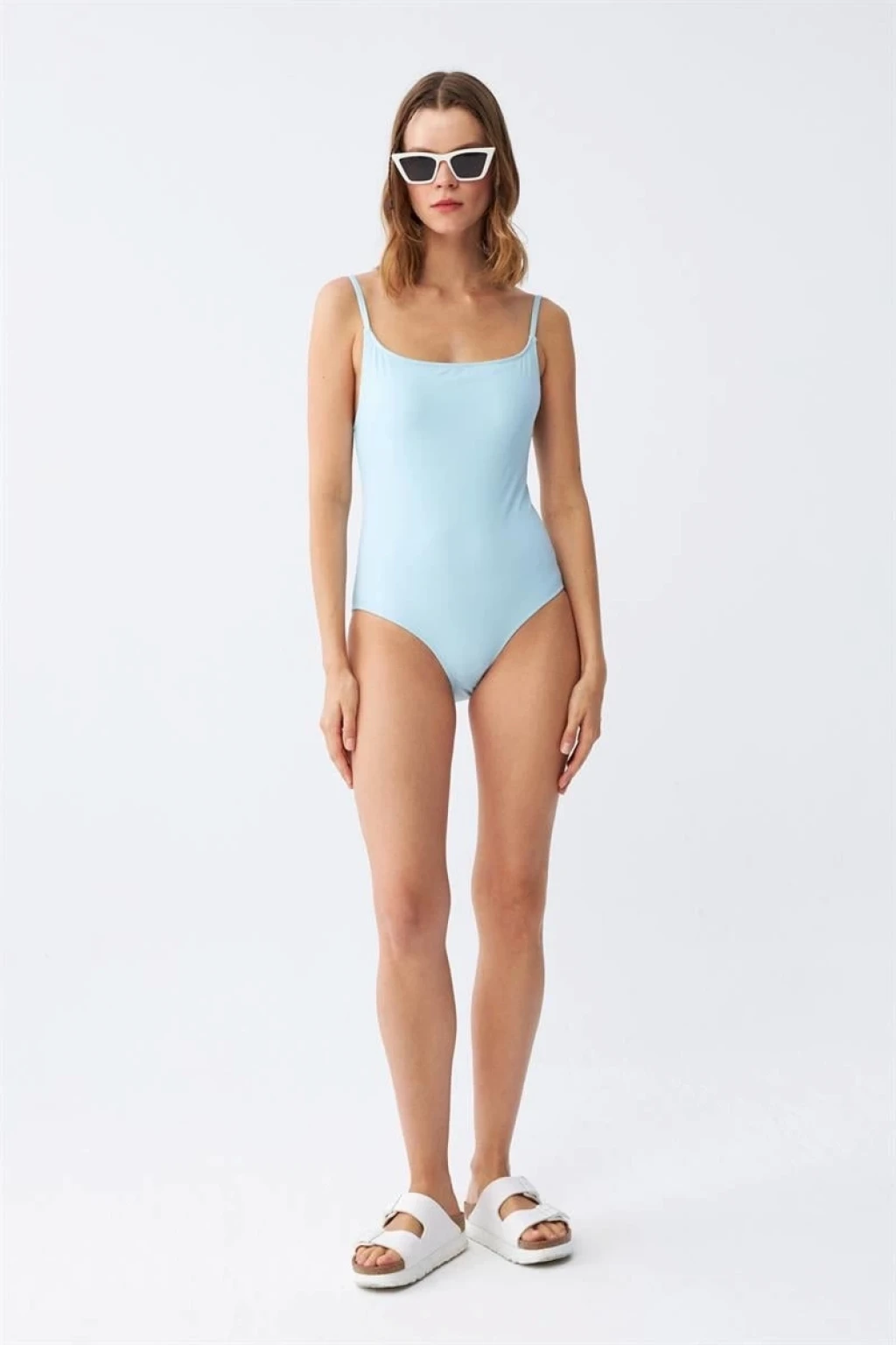 Buz mavisi rengi ile öne çıkan Çamaşır Kenti İnce Askılı Düz Tek Parça Mayo, plajda şıklığıyla fark yaratacak!