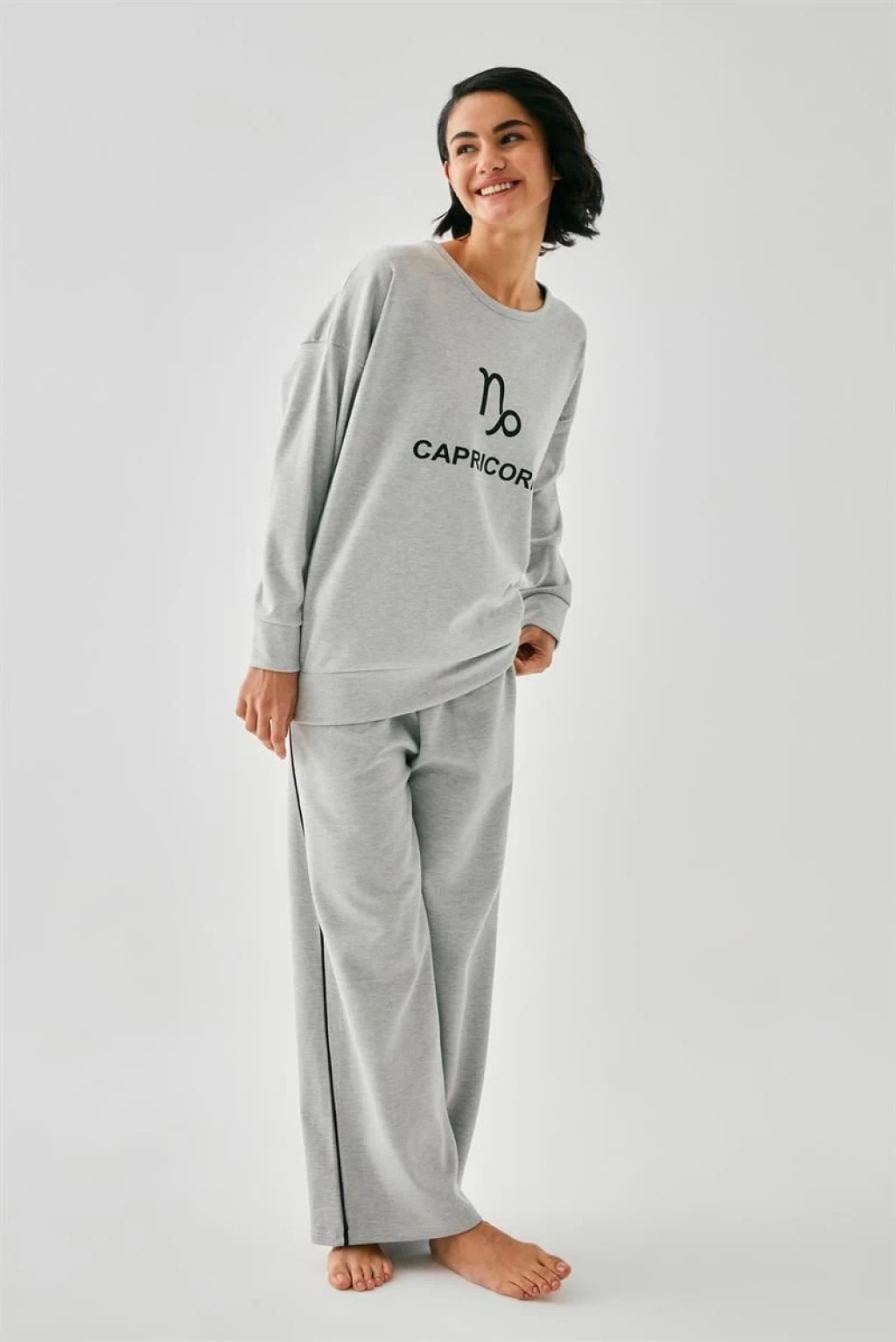 Çamaşır Kenti'nin özel tasarımı olan Kadın Gri Oğlak Burcu Oversize 2 İplik Eşofman Ev Giyim Takımı, rahatlığı ve şıklığı bir arada sunar.