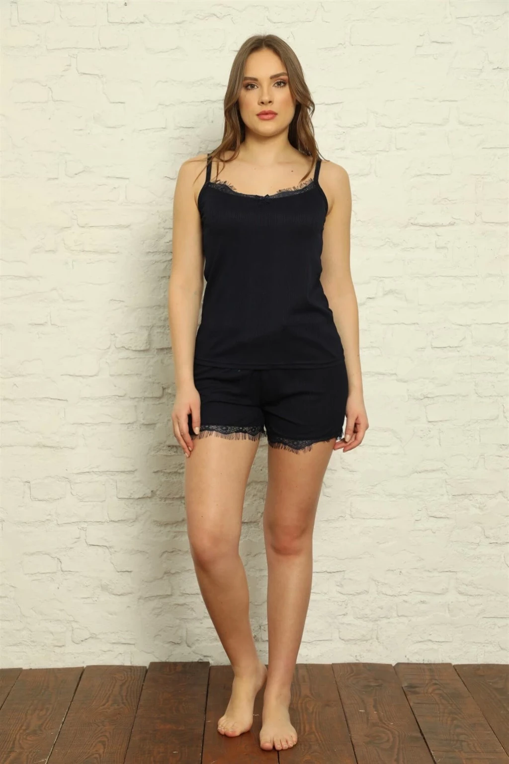 Çamaşır Kenti'nin şıklığı ve rahatlığı bir arada sunan Kadın İp Askılı Şortlu Pijama Takım Lacivert, hem günlük kullanıma hem de özel günlerde tercih edebileceğiniz bir seçenek.