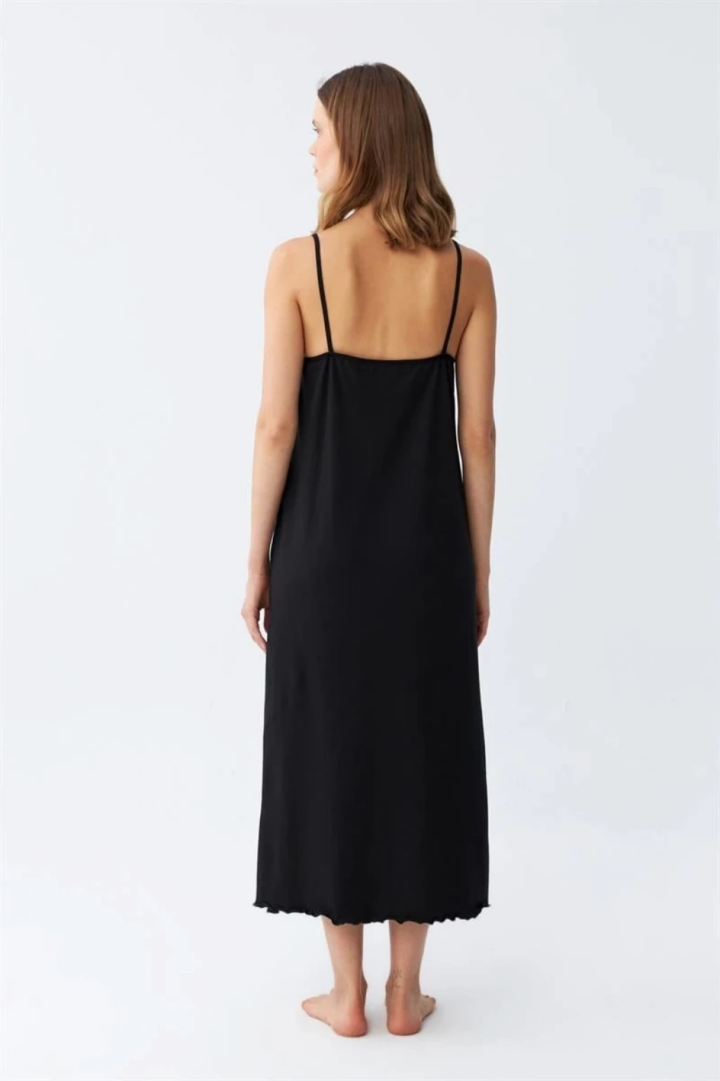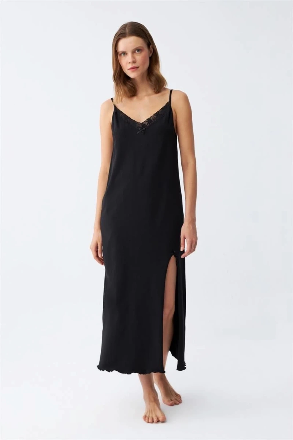 Çamaşır Kenti markasının şık ve rahat tasarımıyla öne çıkan Kadın İp Askılı Uzun Gecelik Siyah, şıklığı ve konforu bir arada sunar.