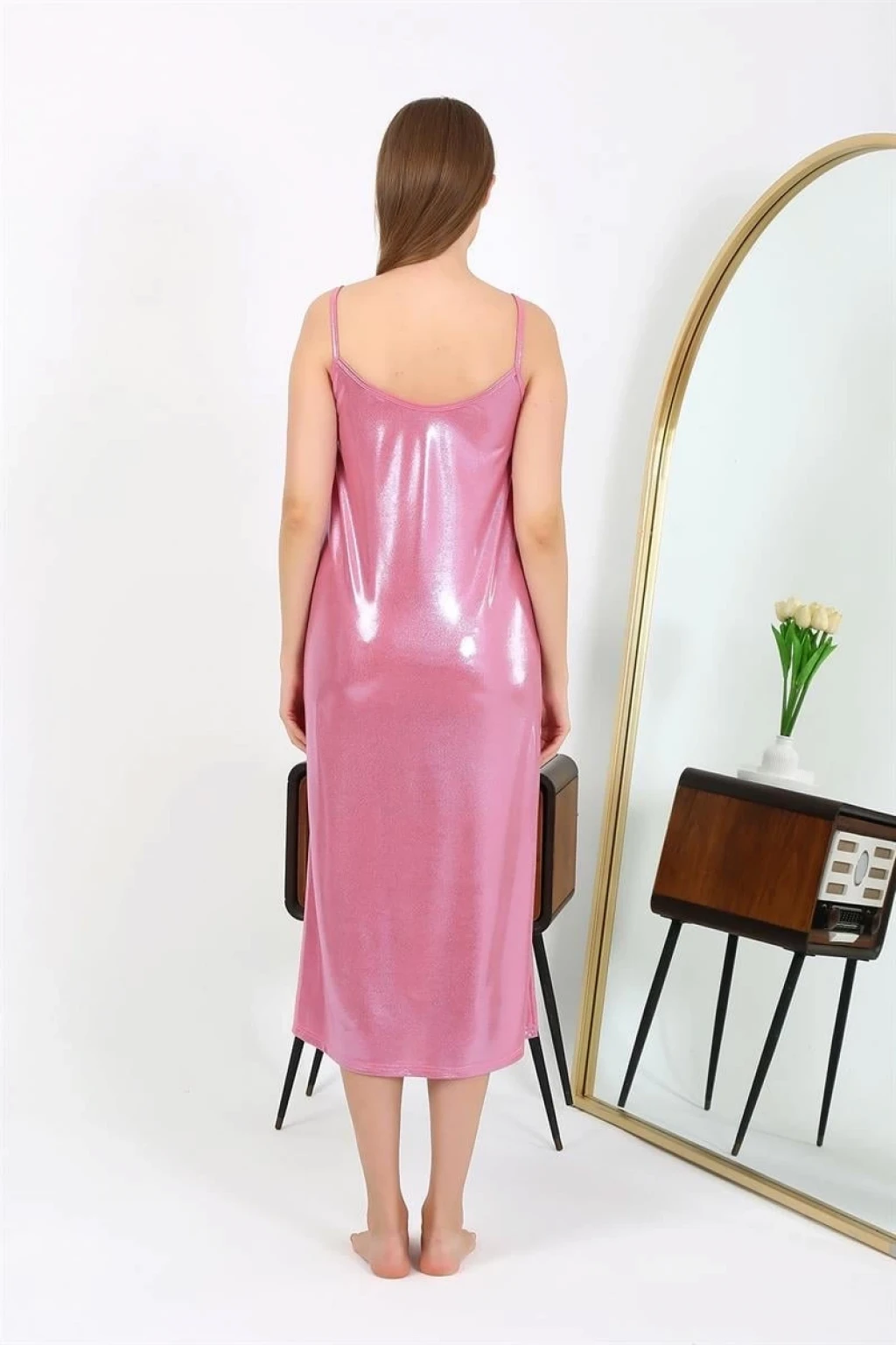 Çamaşır Kenti markasının şık ve şehvetli tasarımıyla karşınızda: Kadın İp Askılı Uzun Parlak Micro Elbise Gecelik Pembe!