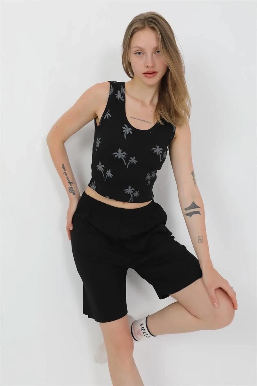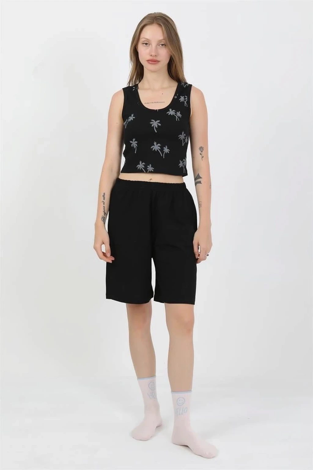 - Kalın askılı üst parça ve şortlu alt parça ile şık bir kombinasyon sunar.