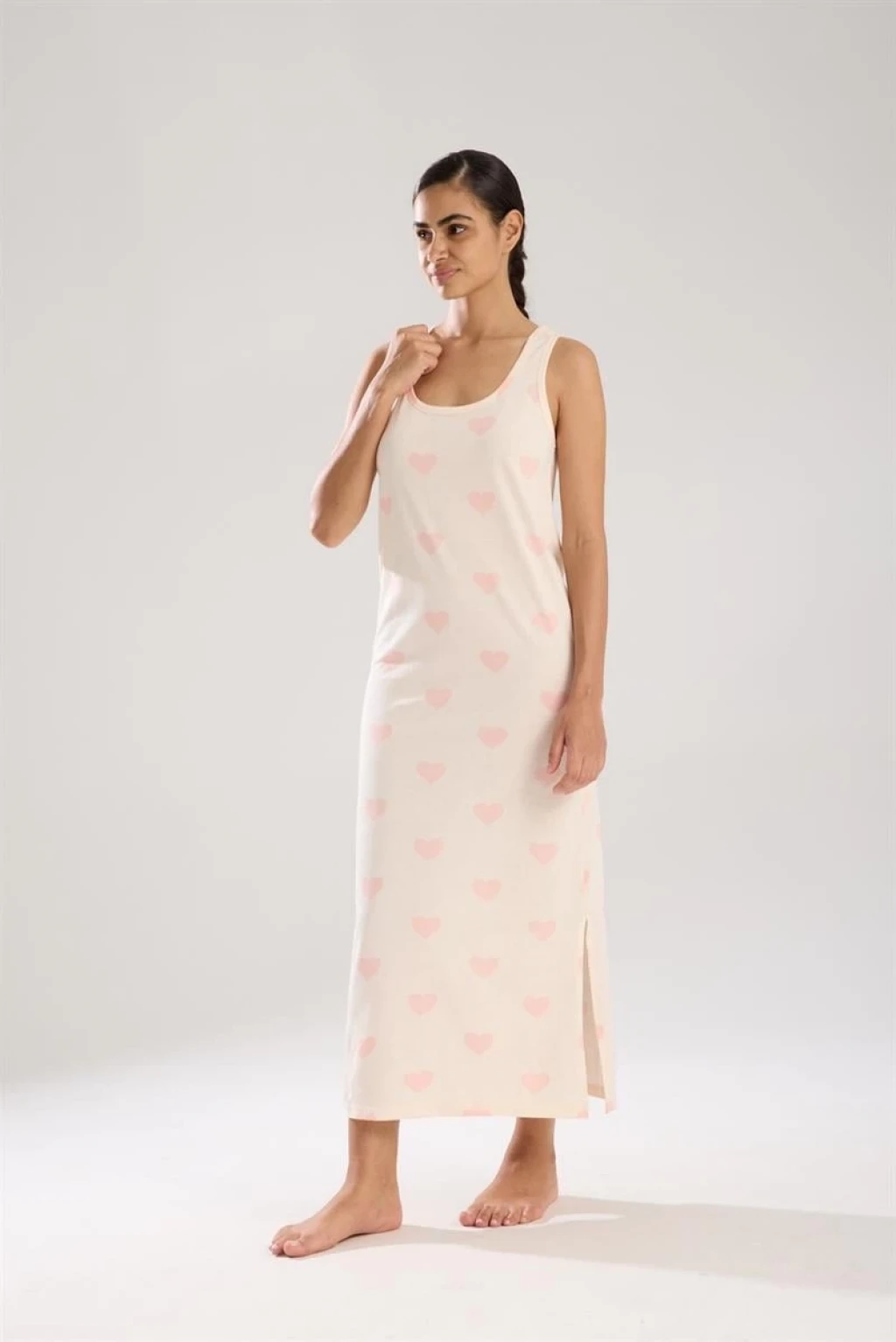 Çamaşır Kenti'nin şık tasarımlı Kadın Kalın Askılı Yırtmaçlı Uzun Pudra Geceliği, konforu ve şıklığı bir arada sunuyor.