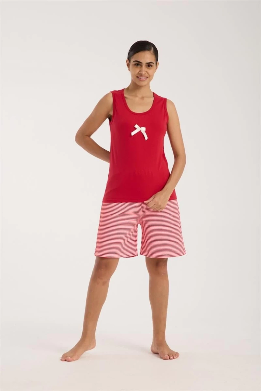 Bu şık pijama takımı ile rahatlık ve şıklığı bir arada yaşayacaksınız. Çamaşır Kenti'nin özel tasarımı olan Kadın Kırmızı Kurdele Detaylı Çizgili Şortlu Pijama Takımı, hem konforlu penye kumaşıyla hem de şık tasarımıyla sizi cezbedecek.