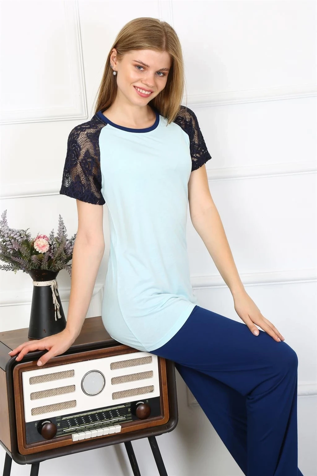 Çamaşır Kenti marka Kadın Kolu Dantelli Penye Pijama Takımı, şıklığı ve konforu bir arada sunar. Su yeşili rengi ile dikkat çeken bu takım, günlük kullanıma uygun şık tasarımı ile öne çıkar.
