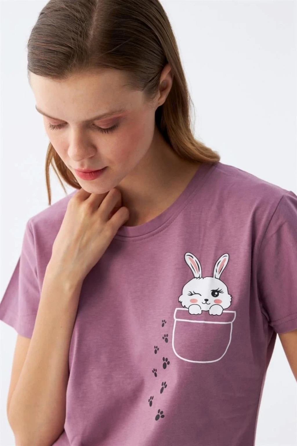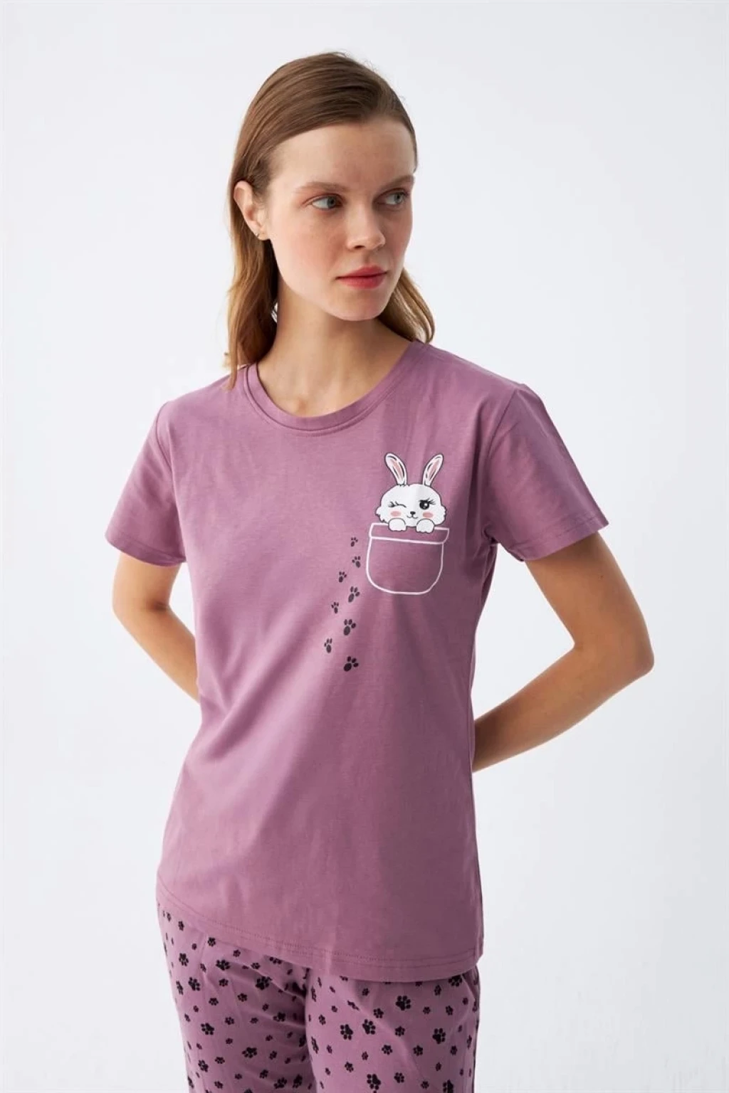 Kadın Mor Patili Tavşan Baskılı Cepli Pijama Takımı, günlük kullanıma uygun ve yıkanabilir özellikleriyle de dikkat çekiyor. Şimdi sipariş vererek bu şık ve konforlu pijama takımına sahip olabilirsiniz.