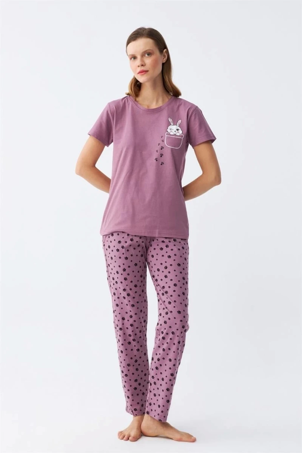 Kadın Mor Patili Tavşan Baskılı Cepli Pijama Takımı, rahatlığı ve şıklığı bir arada sunuyor. Çamaşır Kenti kalitesiyle tasarlanan bu pijama takımı, kullanıcılarına konforlu bir uyku deneyimi yaşatıyor.