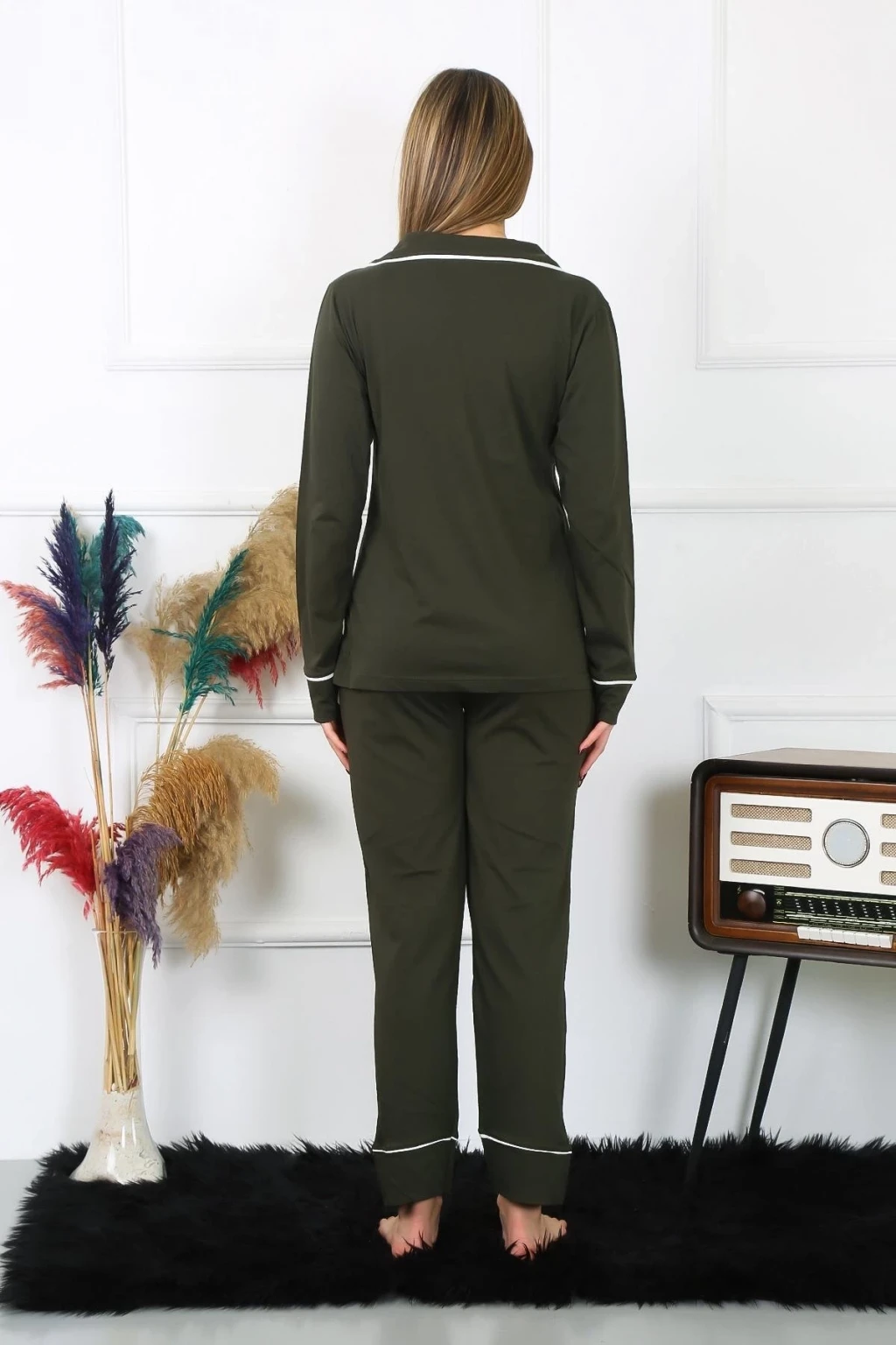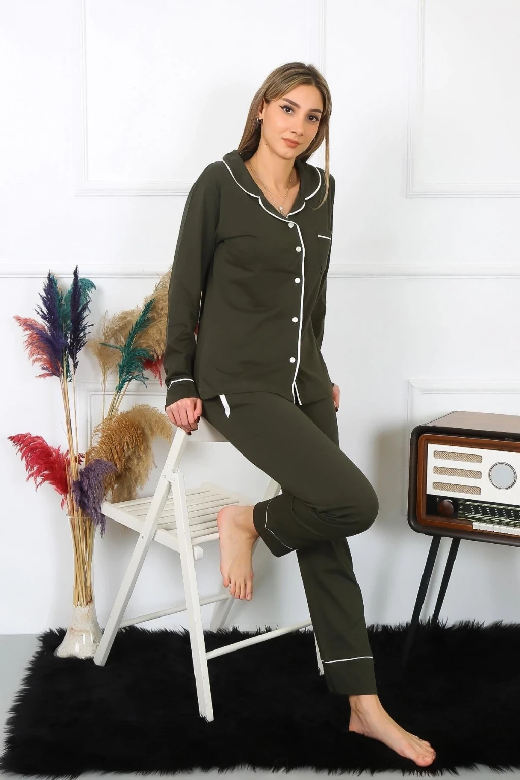 Kadın Pamuk Penye Önden Düğmeli Uzun Kol Haki Pijama Takım, Çamaşır Kenti kalitesiyle şimdi e-ticaret sitemizde! Rahatlığı ve şıklığı bir arada sunan bu pijama takımı, kullanıcılarına konforlu bir gece uykusu vaat ediyor.