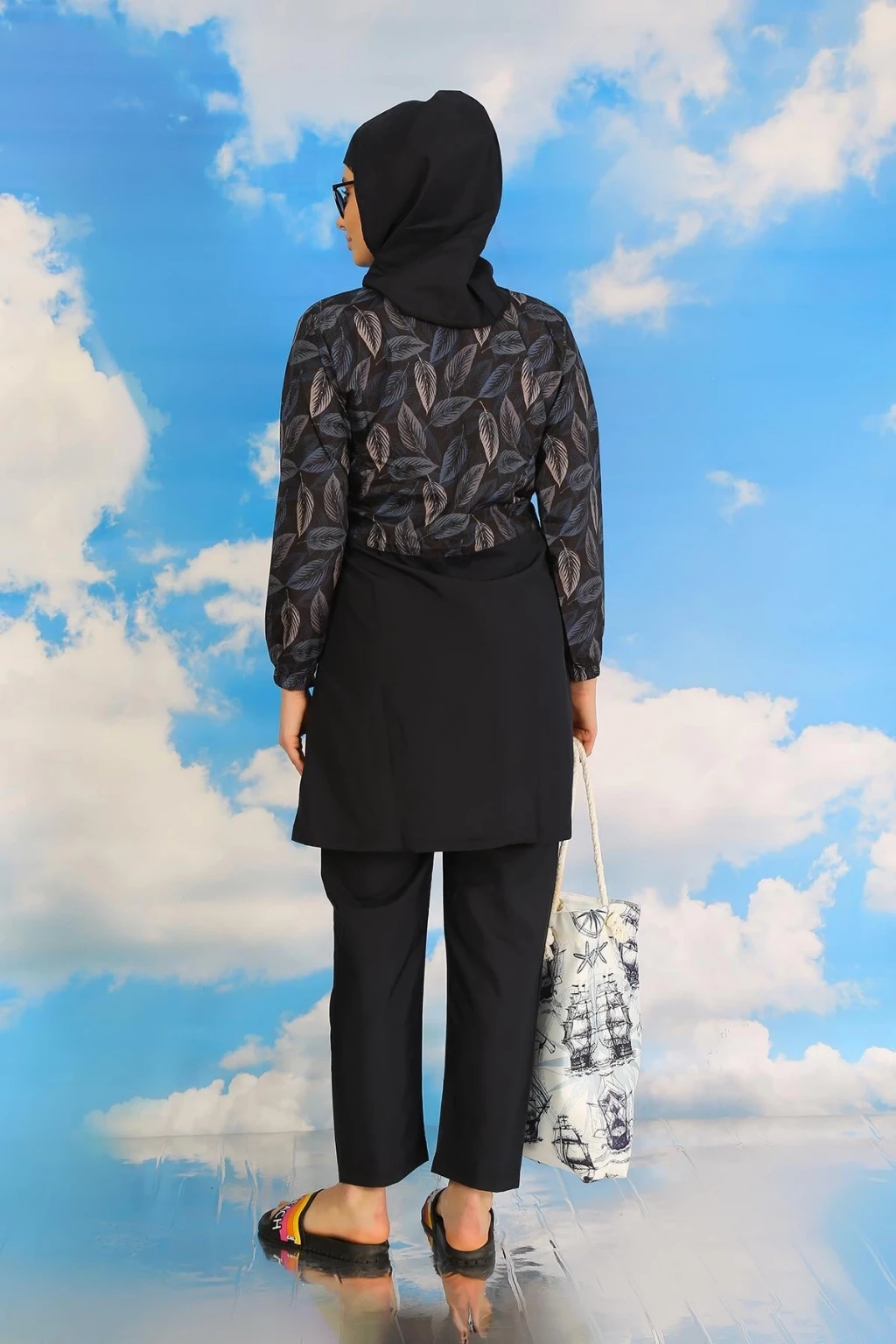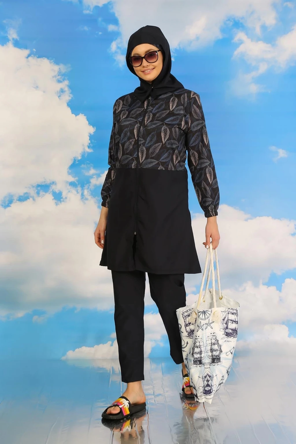 Çamaşır Kenti markasıyla öne çıkan Kadın Pantolonlu Desenli Tam Tesettür Mayo Lacivert, plajda rahat ve şık bir görünüm sunar.