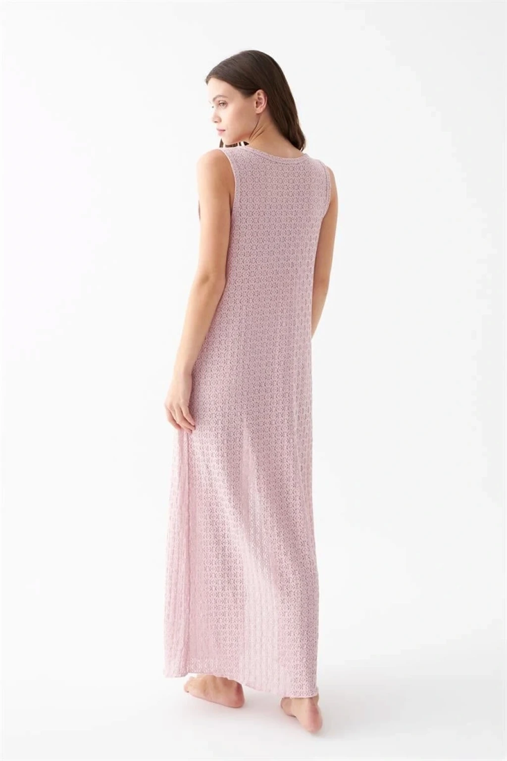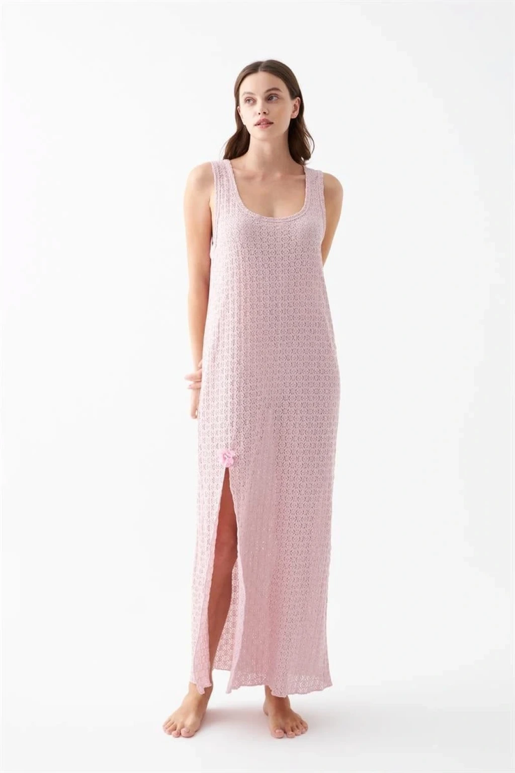 Dantel dokulu yüzey detayı ürüne feminen bir zarafet katarken, yan yırtmaç tasarımı hareket özgürlüğü sağlayarak kullanım konforunu artırır. Pembe rengin yumuşak ve romantik tonu geceliğe modern ve şık bir görünüm kazandırır.