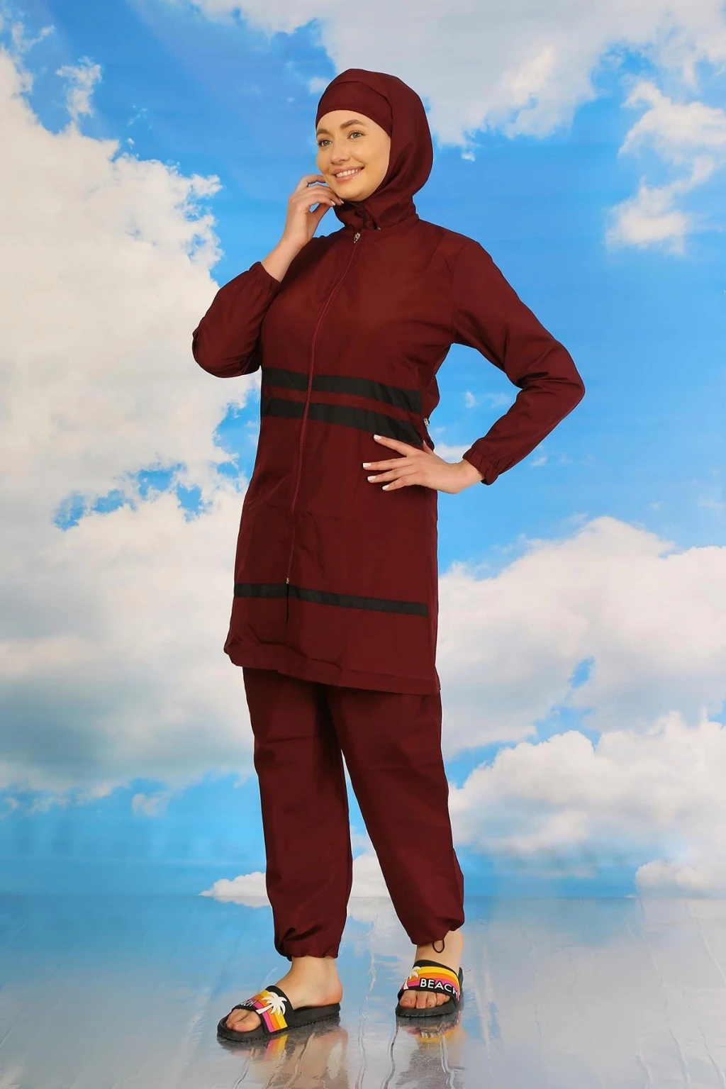 Çamaşır Kenti markasının özel tasarımı olan Kadın Tam Tesettür Mayo Bordo ile plajda şıklık ve rahatlığı bir arada yaşayacaksınız.
