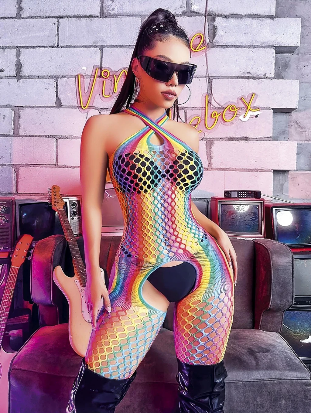 Gökkuşağı Desenli Fileli Fantezi Vücut Çorabı