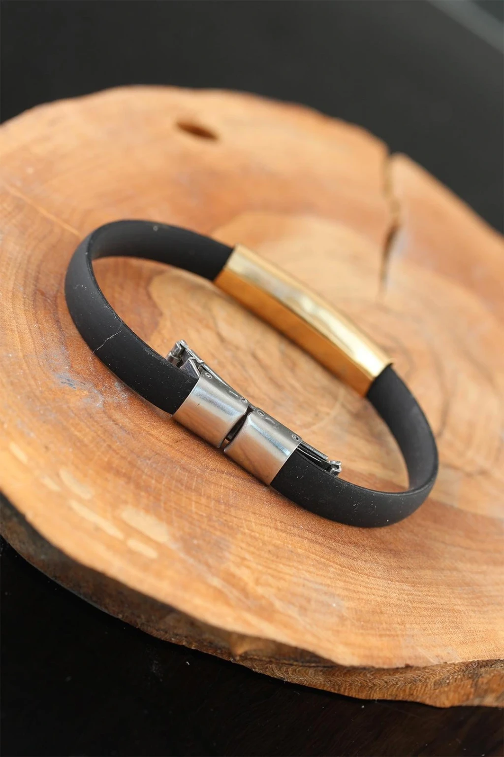 Gold Renk Çelik Yıldızlı Tasarım Siyah Renk Silikon Erkek Bileklik - TJ-EB2520-KS