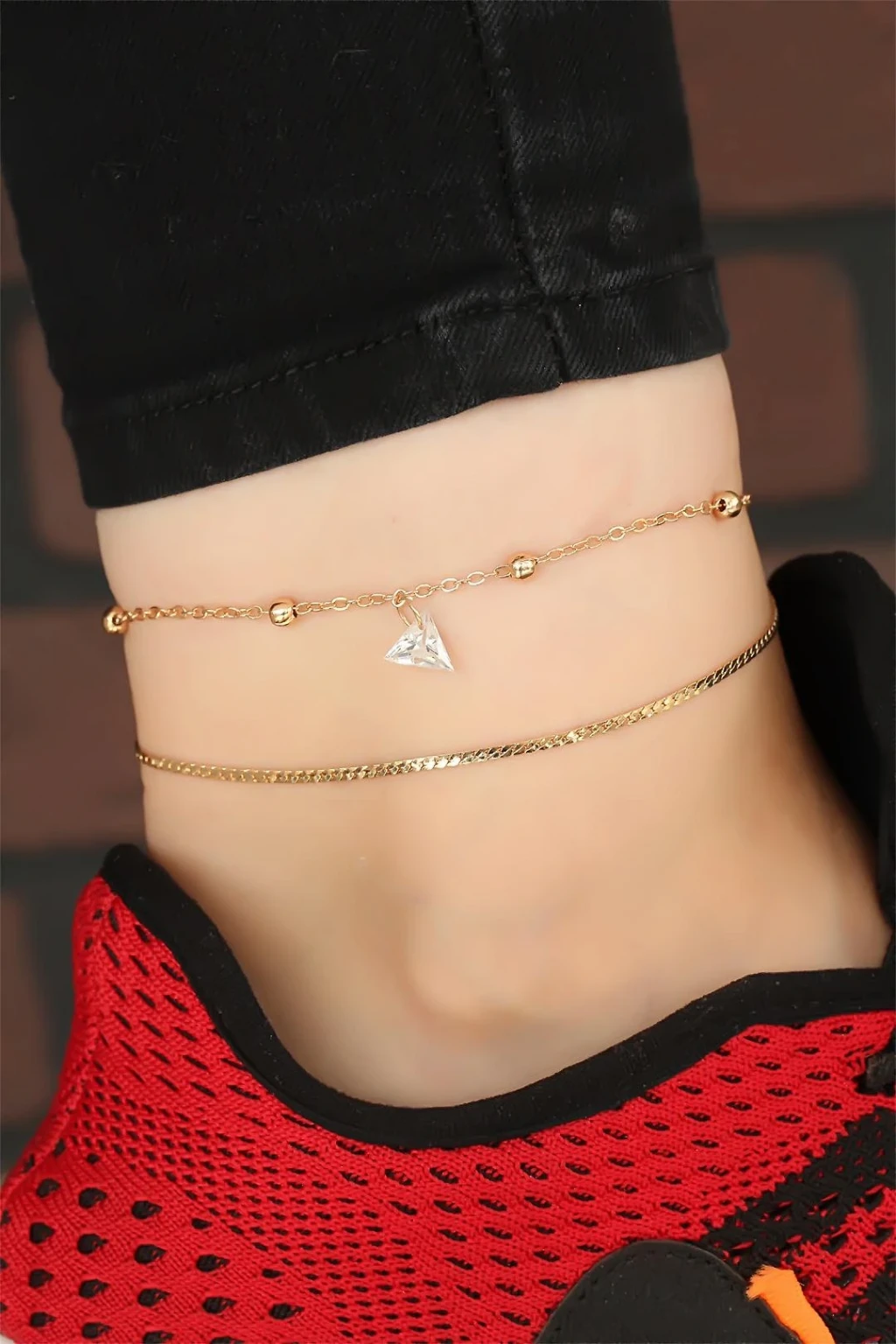 316L Çelik Gold Renk Beyaz Kalpli 2li Halhal - TJ-HH1584