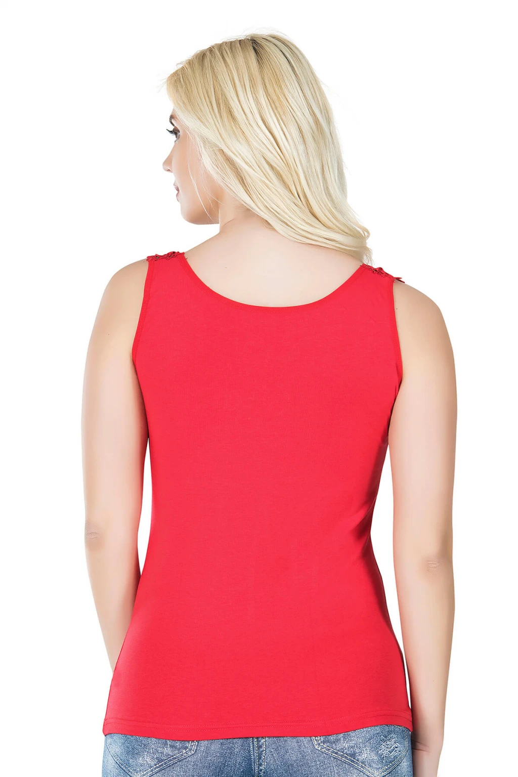Güpür kabartma dantel detaylı tasarımıyla şık bir görünüm kazandıran sıfır kol kadın tişört modelidir.