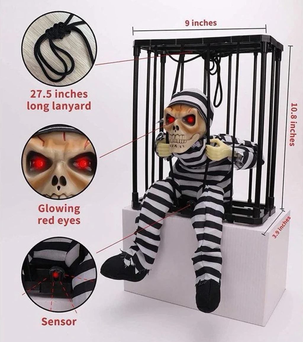 Hareketli Sesli Sensörlü Mahkum Görünümlü Kuru Kafa İskelet Dekorasyon Ürün Ölçüsü : 22x27 Cm Ürün Sensörlüdür , Herhangi Bir Ses Algıladığında Çalışmaya Başlar Ürün Pil Ile Çalışmaktadır
