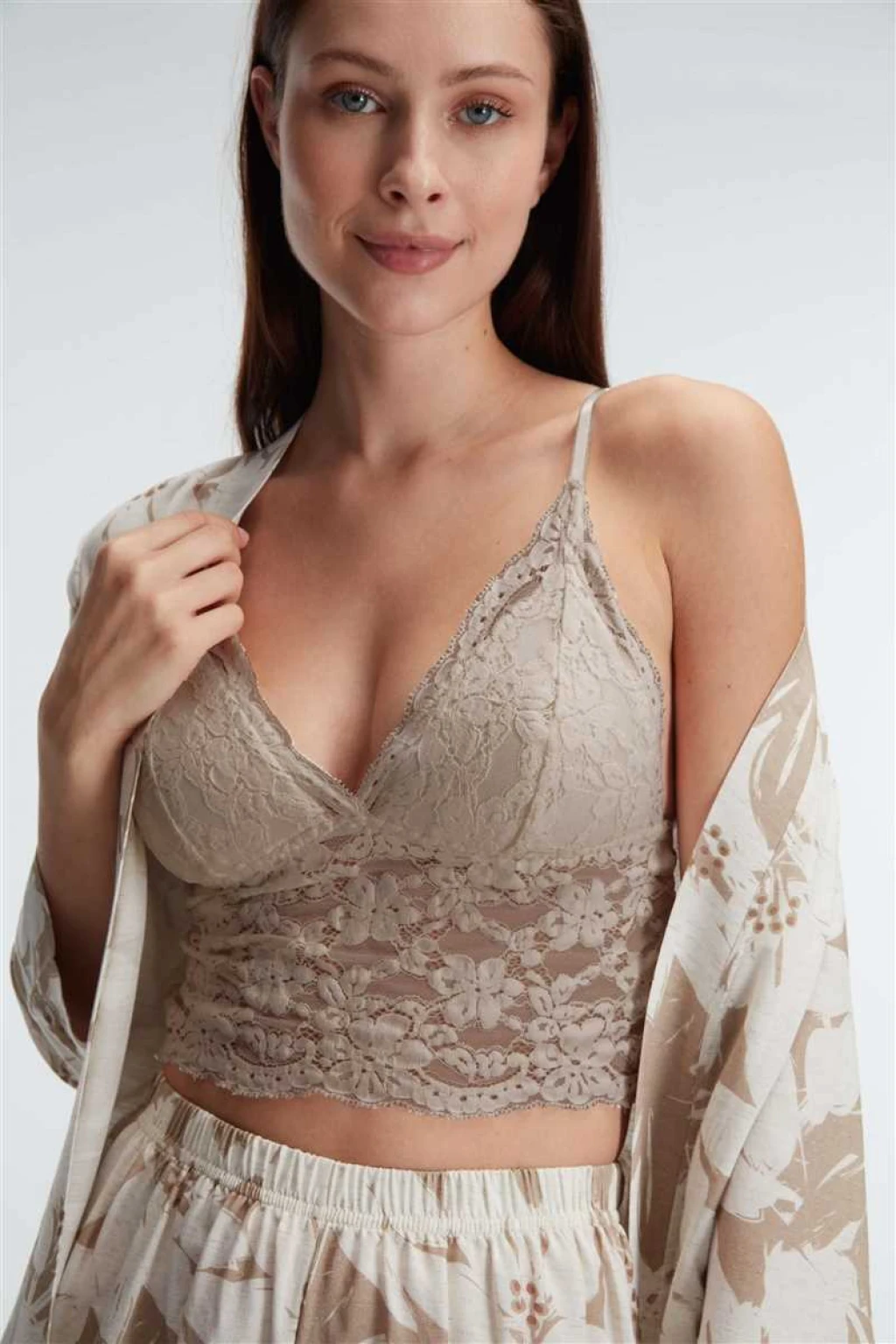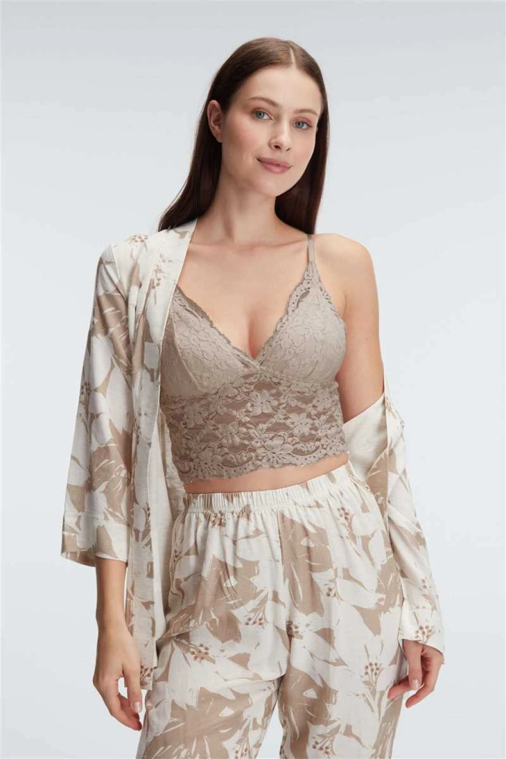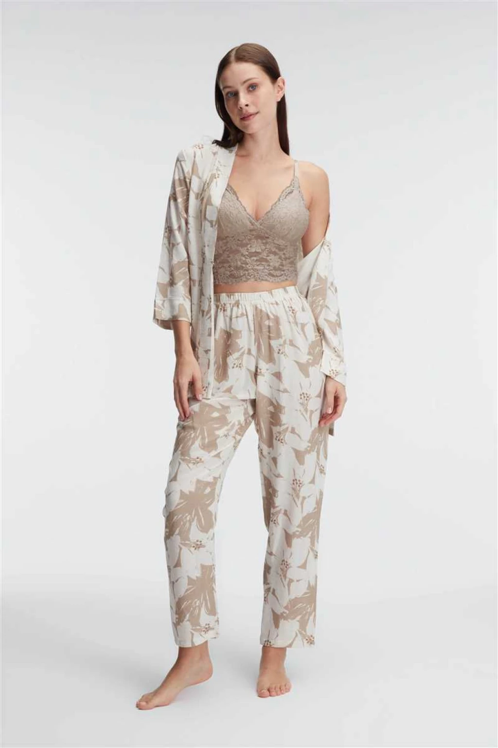 5830 Günlük Basic Ev Giyimi İp Askılı V Yaka KADIN Polyamid Elastan Çiçek Desenli Yazlık Dokuma Normal Bel UZUN Diz_Altı Uzun Paçalı Dantel Detaylı Pijama Takımı Sabahlık modelimiz