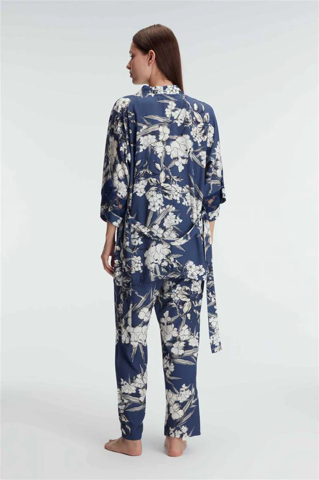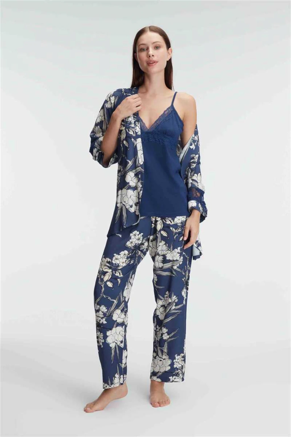 5825 Günlük Basic Ev Giyimi İp Askılı V Yaka Kadın Viskon Çiçek Desenli Yazlık Örme Normal Bel Uzun Diz_Altı Uzun Paçalı Dantel Detaylı Pijama Takımı Sabahlık modelimiz