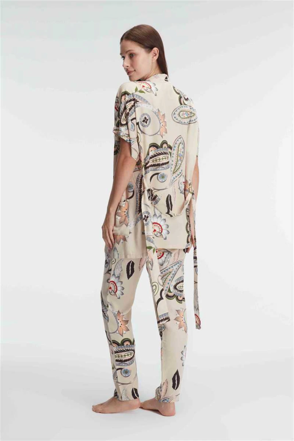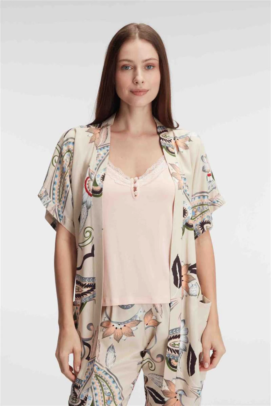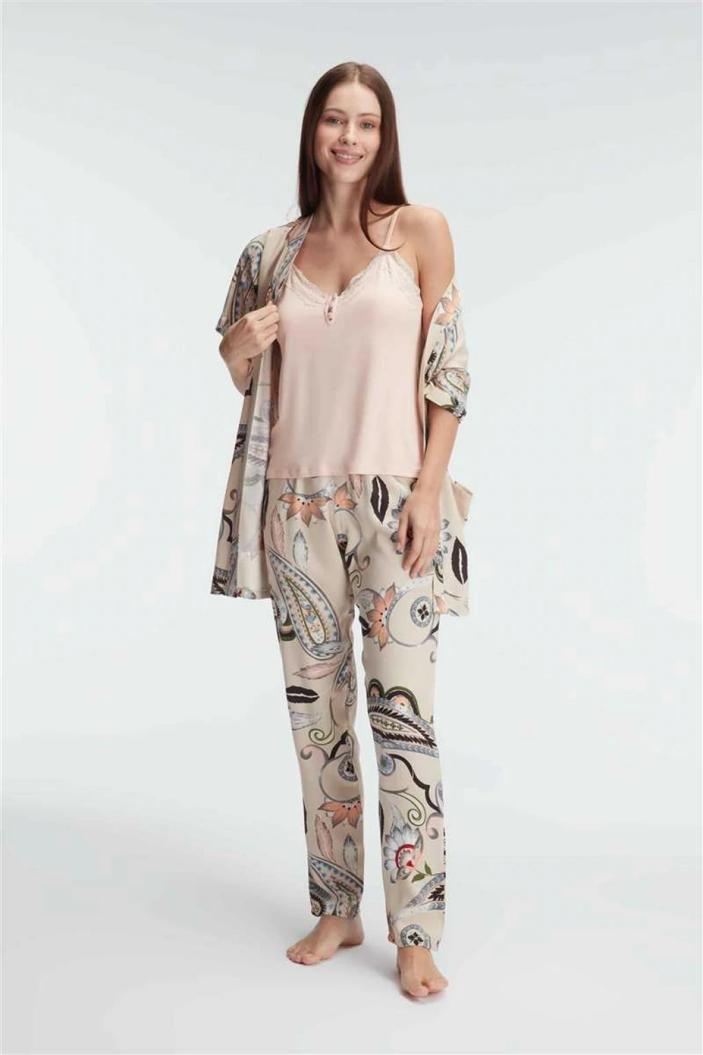 5840 Günlük Basic Ev Giyimi İp Askılı V Yaka KADIN Viskon Çiçek Desenli Yazlık Örme UZUN Diz_Altı Uzun Paçalı Dantel Detaylı Pijama Takımı Sabahlık modelimiz