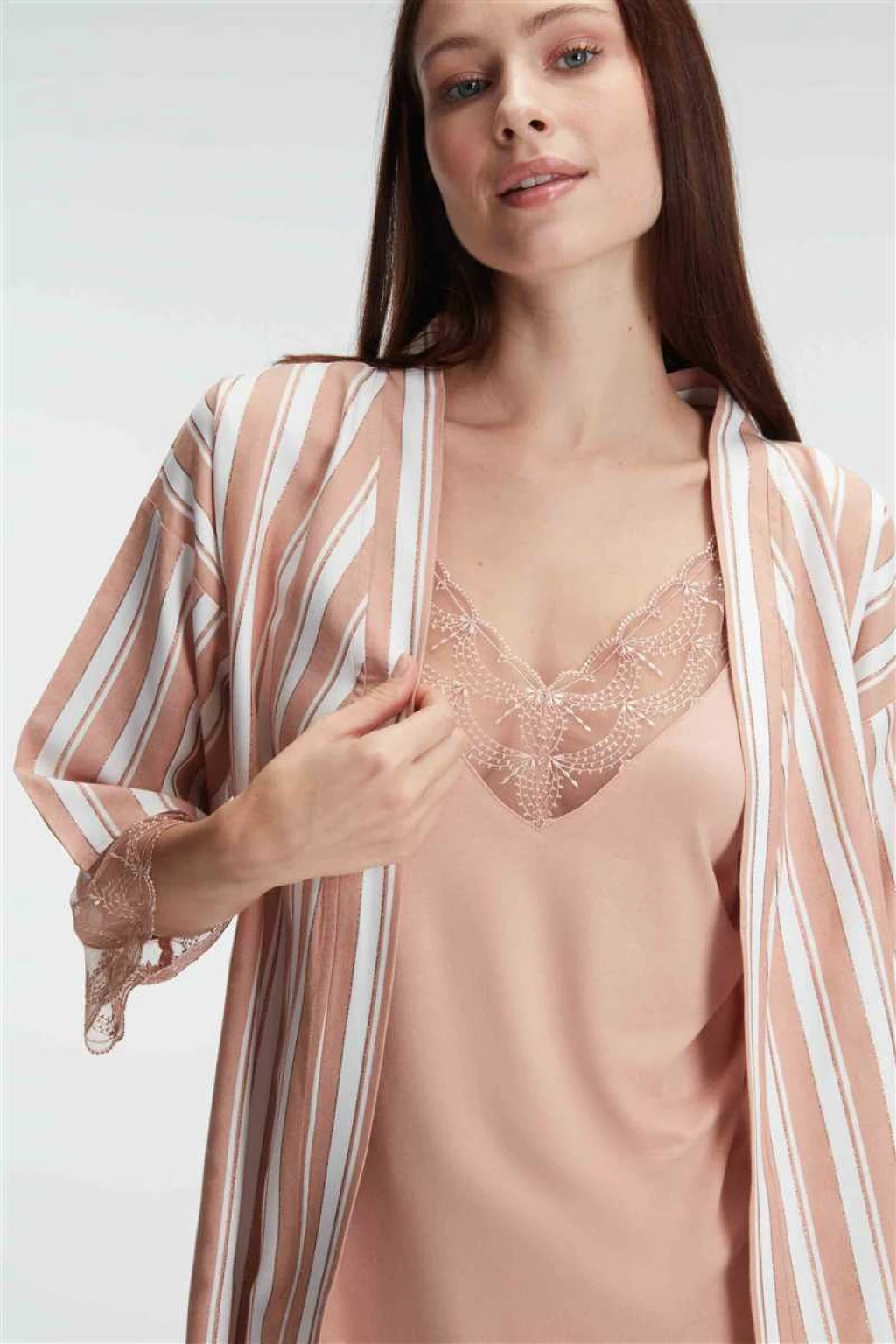 5821 Günlük Basic Ev Giyimi İp Askılı V Yaka Kadın Viskon Çizgili Desenli Yazlık Örme Normal Bel Uzun Diz_Altı Uzun Paçalı Pijama Takımı Sabahlık modelimiz
