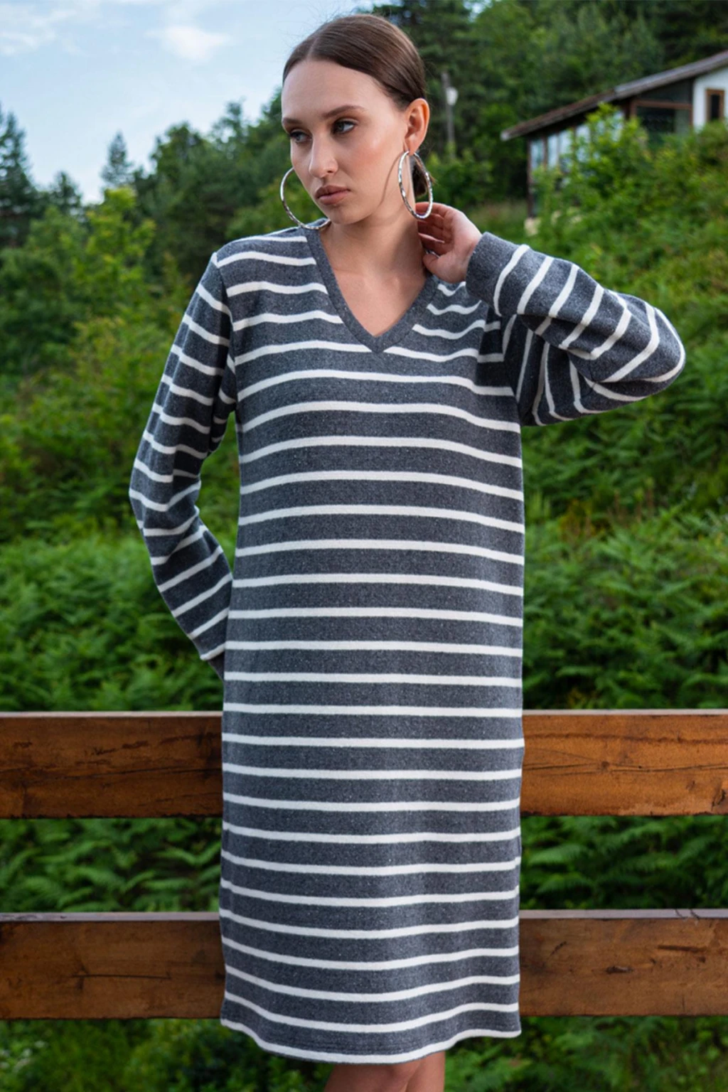 Kadın Gri Çizgili Uzun Kollu Fiyonk Detaylı Pijama Takımı Rahat Mevsimlik