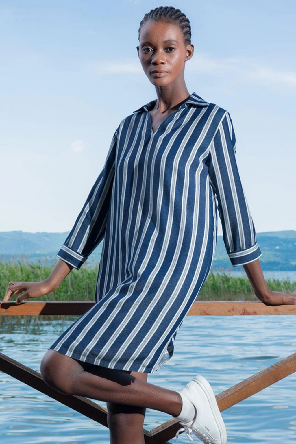 Kadın Gri Çizgili Uzun Kollu Fiyonk Detaylı Pijama Takımı Rahat Mevsimlik