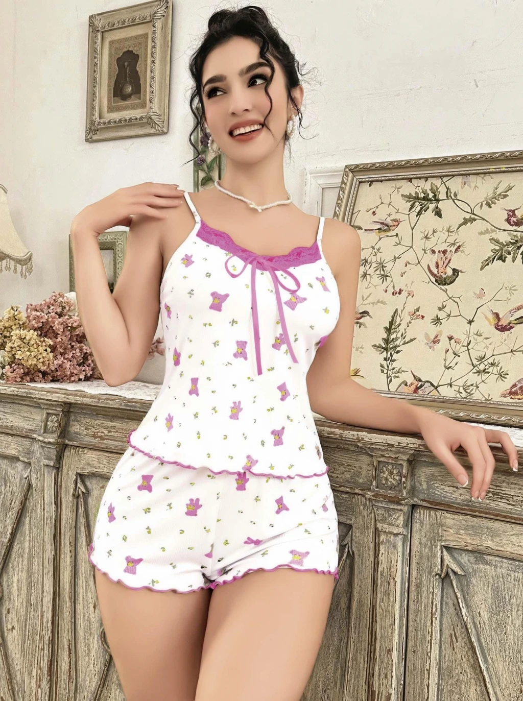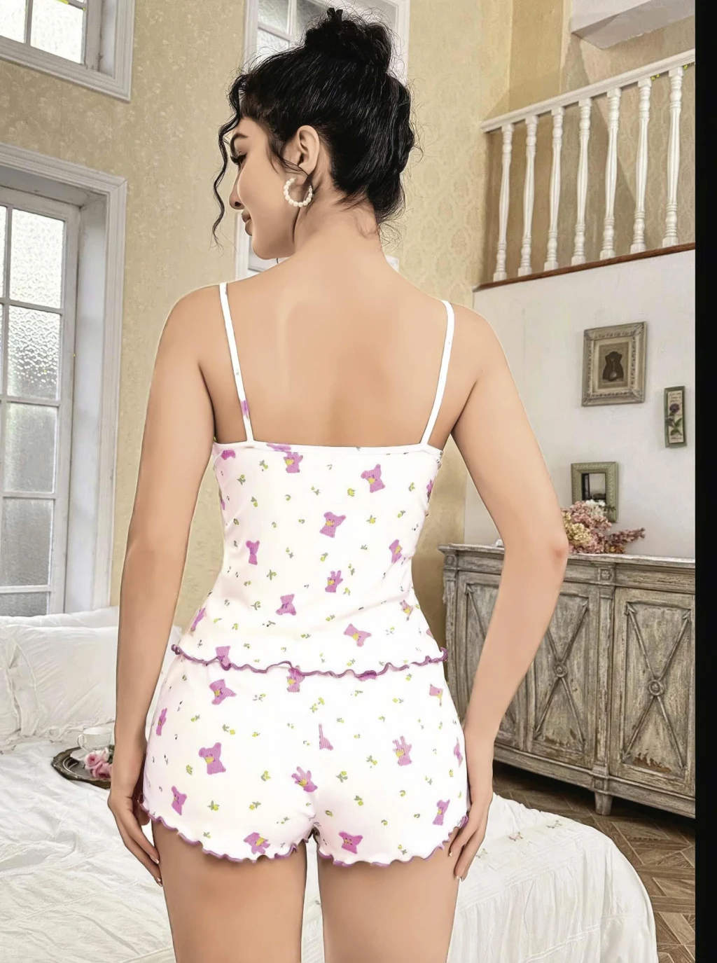 Beyaz gül ve vişne desenli şortlu gecelik takımı, eğlenceli ve dikkat çekici bir tasarıma sahiptir. Hafif kumaşı ile rahat kullanım sunarken enerjik bir stil yaratır.