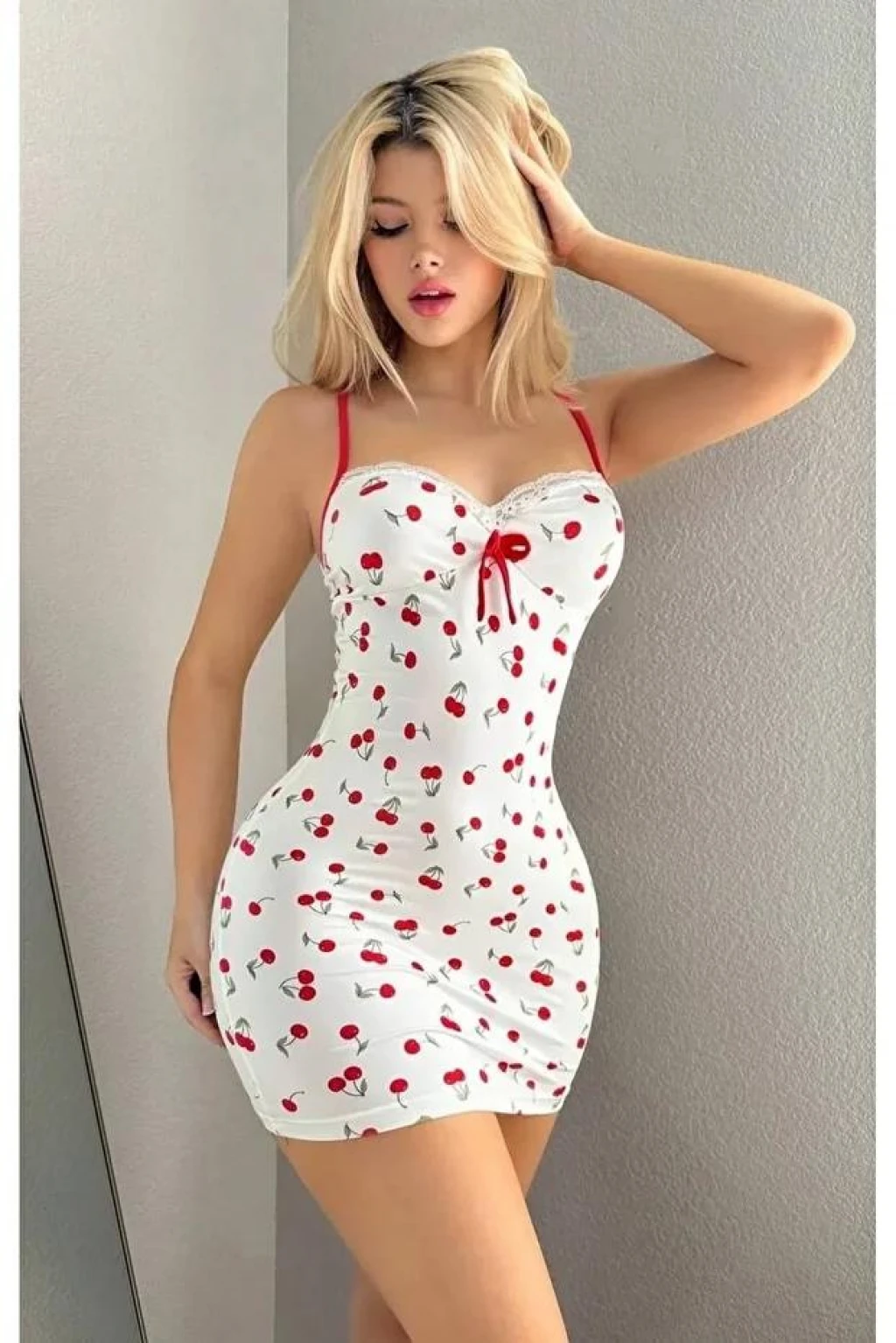 Kadın Beyaz Kiraz Desenli Askılı Bağlamalı Dantel Detaylı Elbise 5073