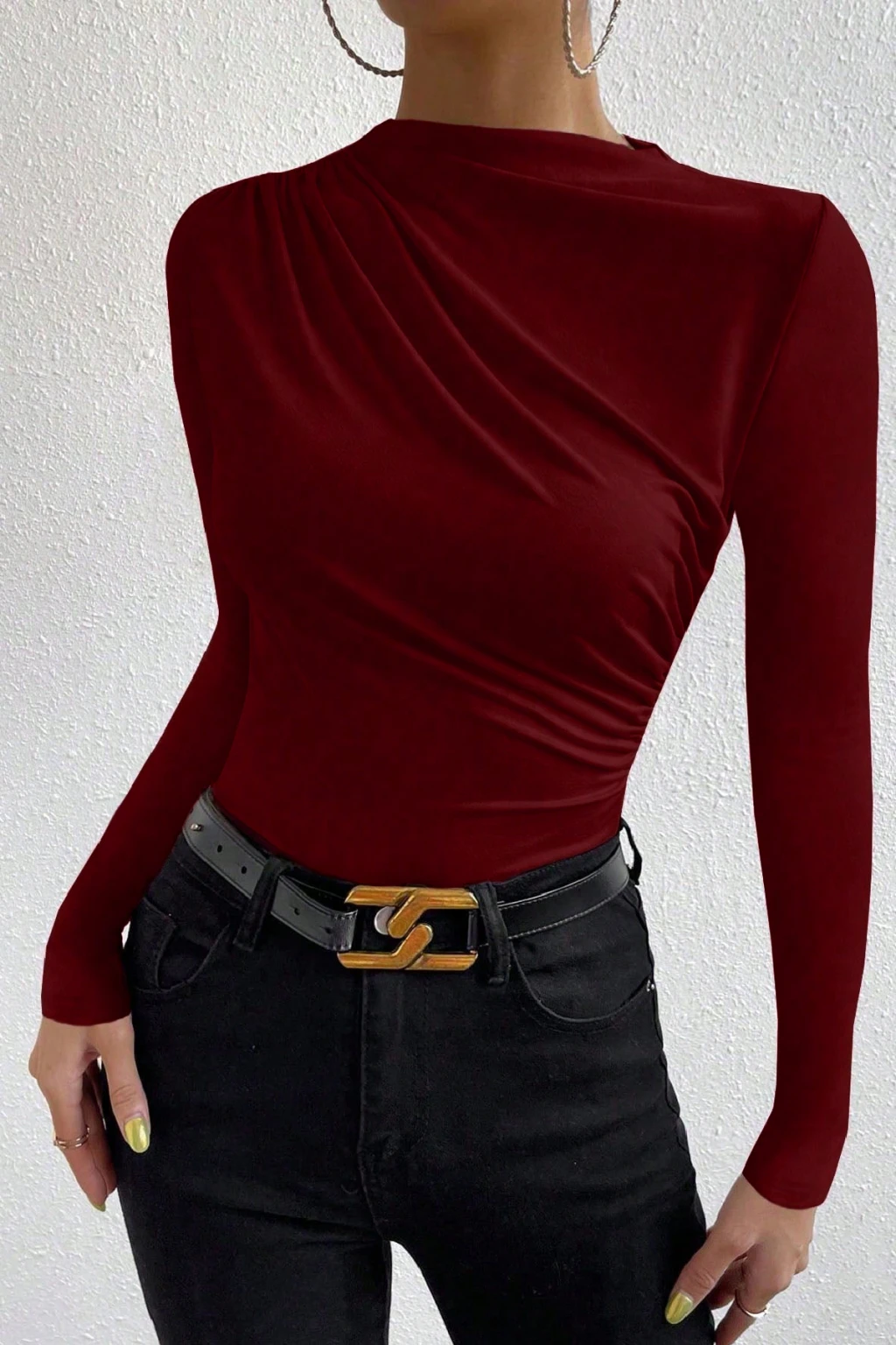 Sıcak Tonlarda Zarif Bir DokunuşKadın Bordo Belden ve Boyundan Büzgü Detaylı Bluz, bordo rengin asil duruşuyla sofistike bir şıklık sunar.Boyun ve bel kısmındaki zarif büzgüler, vücuda oturan formu destekleyerek kadınsı bir siluet oluşturur.Esnek, dökümlü kumaşı sayesinde gün boyu konforlu bir kullanım sağlar.Modern tasarımıyla hem gündüz hem de akşam kombinlerine kolayca uyum sağlayan bu bluz, zarafetle modern çizgiyi bir araya getirir.Öne Çıkan ÖzelliklerRenk: BordoKumaş: Esnek, dökümlü ve nefes alabilirYaka Tipi: Hafif asimetrik, büzgü detaylıKol Tipi: Uzun, dar formDetay: Boyun ve bel kısmında büzgü, vücuda oturan tasarımStil: Şık – Feminen – GünlükSezon: Bahar / SonbaharStil ÖnerileriGündüz Şıklığı: Açık tonlu jean ve bej kısa topuklu botlarla sıcak bir kontrast oluşturun.Ofis Kombini: Gri veya siyah pantolon ve stiletto ayakkabılarla profesyonel bir görünüm yakalayın.Akşam Stili: Deri etek veya saten pantolonla kombinleyin. Altın tonlu aksesuarlarla bordo rengin asaleti öne çıkar.Neden Tercih Etmelisiniz?Bordo rengin zarif ve dikkat çekici tonuyla güçlü bir duruş kazandırır.Boyun ve bel büzgüsü vücut hatlarını zarifçe vurgular.Çok yönlü tasarımıyla hem gündüz hem gece kullanıma uygundur.Esnek kumaş yapısı ile konforlu ve kusursuz bir görünüm sağlar.Kadın Bordo Belden ve Boyundan Büzgü Detaylı Bluz, modern çizgileriyle her stile zarafet katacak özel bir tasarım.Bordo rengin enerjisini stilinize yansıtın, şıklığınızla fark yaratın!]]>