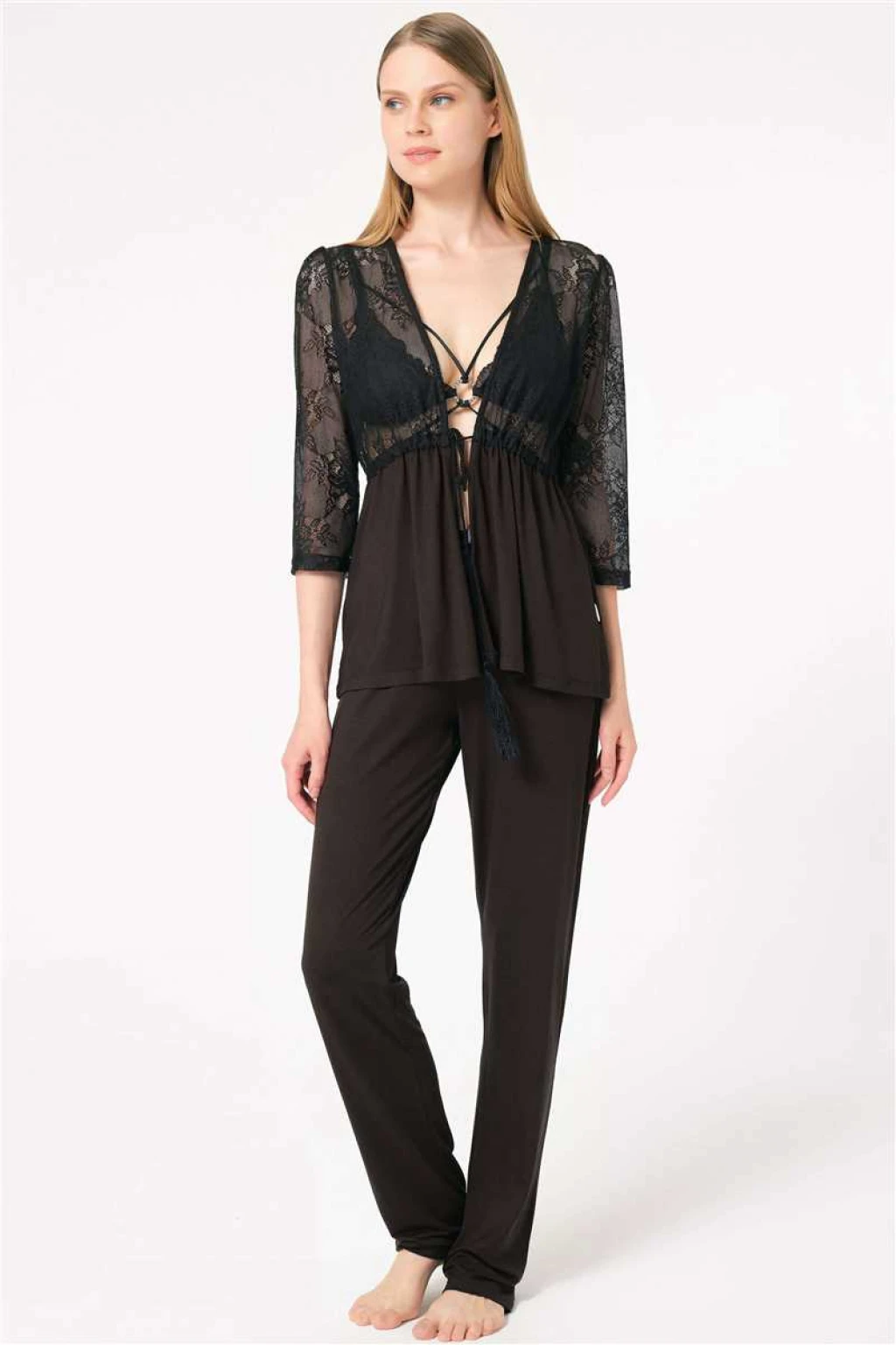 Kısa Ad:Kadın Dantelli Sabahlık Balensiz Desteksiz Dolgusuz Yaka Detaylı Sütyen ve Pantolon Pijama 3'lü Takım (5698)