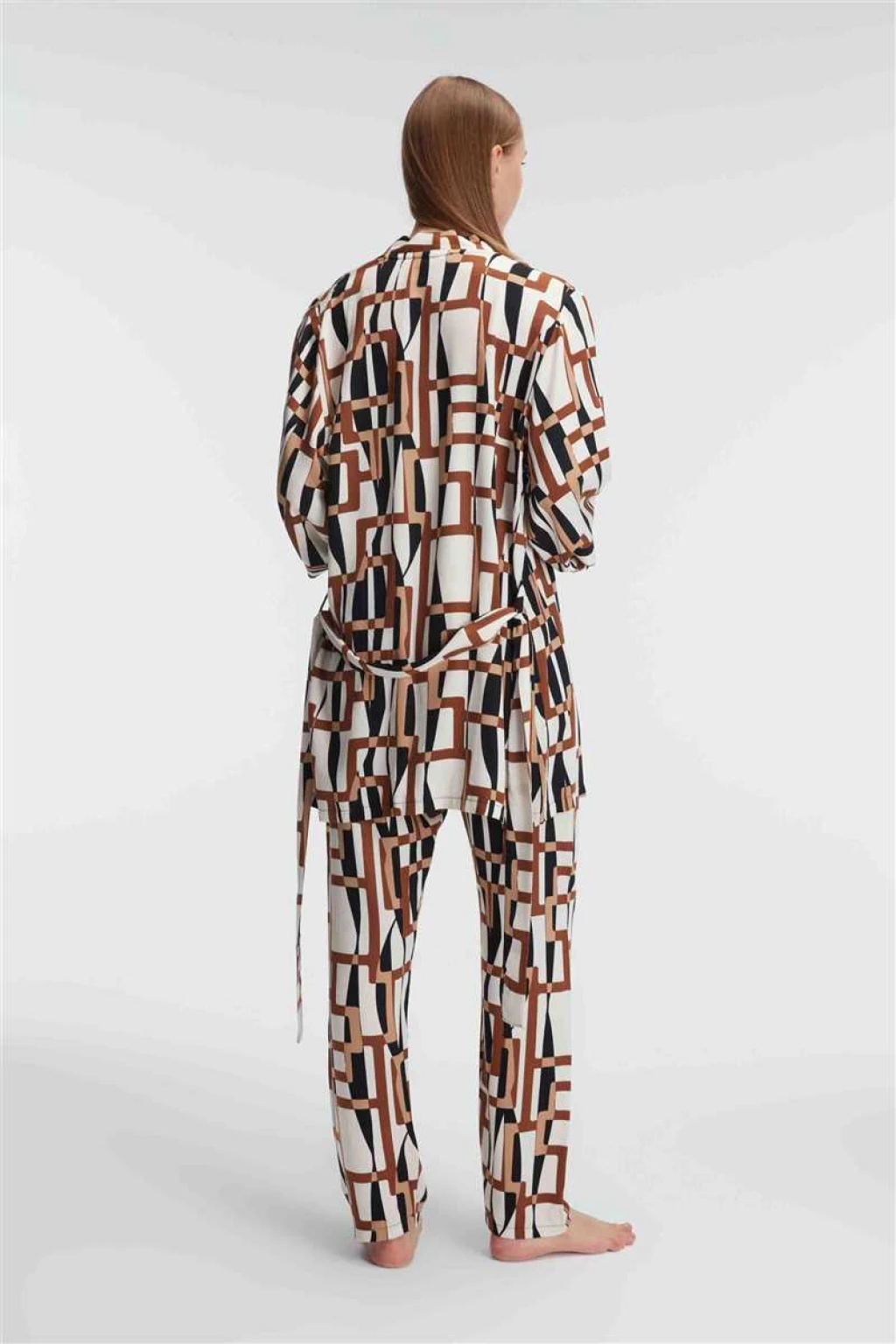 Sıfır Kol V Yaka Kadın Viskon Geometrik Yazlık Uzun İp Detaylı Pijama Takımı
