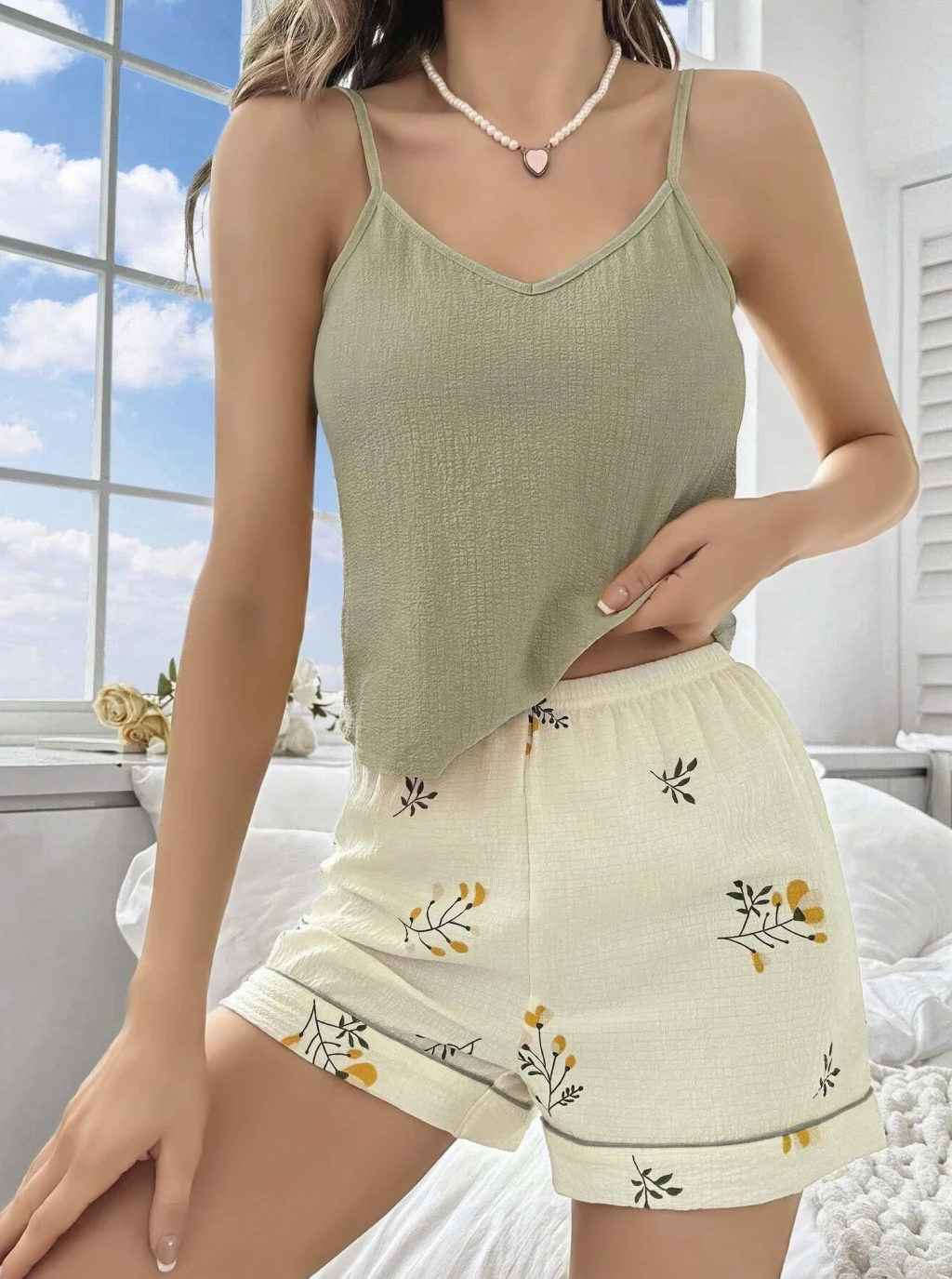 Kadın Ekru çiçek baskılı şortlu gecelik pijama takımı, cesur ve şık bir görünüm yaratır. Yumuşak kumaşı sayesinde rahat kullanım imkanı sunar.