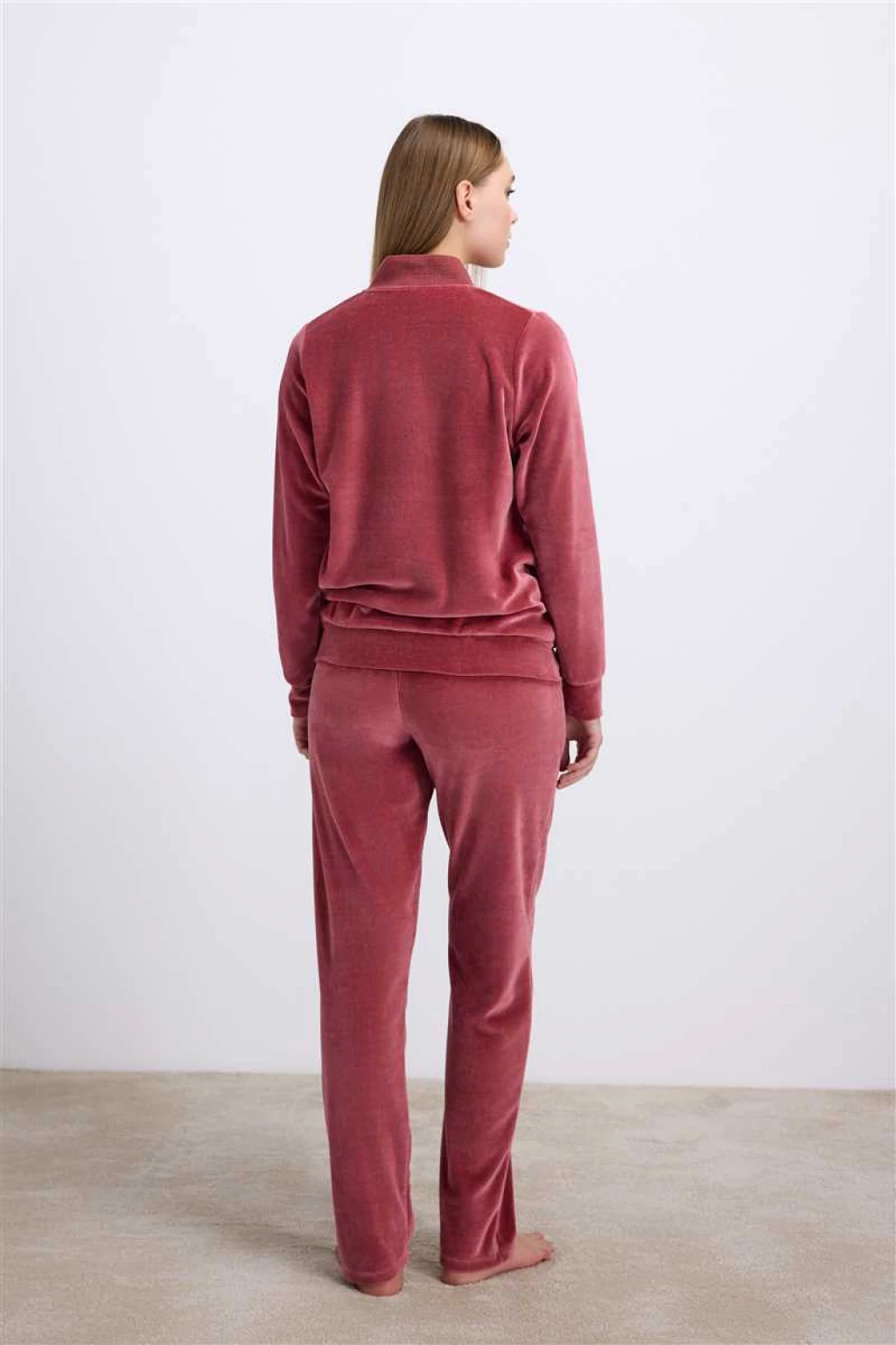 Evde geçirilen her an, zarafet ve konforun bir yansıması olmalı. ’in 11560 kodlu bu özel takımı, yumuşacık dokusu, modern kesimi ve doğal içerikli kumaşıyla bu dengeyi mükemmel şekilde kuruyor.Kumaş içeriğinde yer alan %40 TENCEL™ Modal, %40 Pamuk ve %20 Polyester, doğallık ile dayanıklılığı bir araya getirir. TENCEL™ Modal lifleri, sürdürülebilir kaynaklardan elde edilen doğal selülozdan üretilir ve ciltte ipeksi bir yumuşaklık hissi bırakır. Pamuk, nefes alabilirlik ve doğallık sunarken; polyester ilavesi kumaşın formunu korumasına yardımcı olur. Sonuç: hem uzun ömürlü hem de son derece konforlu bir ev stili.Üst parça, fermuarlı sweatshirt formuyla sportif bir zarafet sunar. Yumuşacık kadife dokusu, pastel gül tonundaki rengiyle birleşerek feminen ve sıcak bir görünüm oluşturur. Sol göğüs kısmındaki zarif nakış detayı, sadeliğiyle dikkat çeker. Hafif dökümlü kesimi, rahat bir kullanım sağlarken, cepler işlevsel bir konfor ekler.Alt parça, esnek beli ve dökümlü paça formuyla gün boyu hareket özgürlüğü sunar. Kumaşın kadifemsi yüzeyi, teninizde yumuşak bir sıcaklık hissi yaratır; bu da onu özellikle sonbahar ve kış mevsimlerinde ideal kılar.Evde dinlenirken, kitap okurken ya da sabah kahvenizi yudumlarken bu takım, zarif ama rahat bir görünüm sunar. İsterseniz günlük yürüyüşlerinizde veya seyahatlerinizde de rahatlıkla tercih edebilirsiniz.Detaylar:Ürün kodu: 11560Renk: Gül KurusuKumaş içeriği: %40 TENCEL™ Modal, %40 Pamuk, %20 PolyesterFermuarlı üst, uzun kollu sweatshirt formuKadife dokulu, yumuşak yüzeyNakış detaylı göğüs kısmıDökümlü pantolon, elastik belNefes alabilir, esnek ve formunu koruyan kumaş