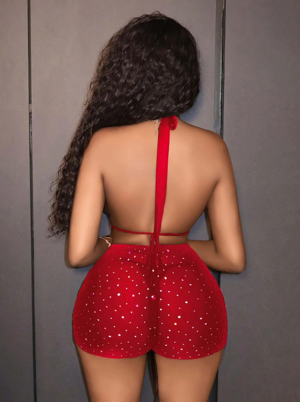 Kırmızı Yırtmaç Detay Simli Fantezi Mini Club Elbisesi