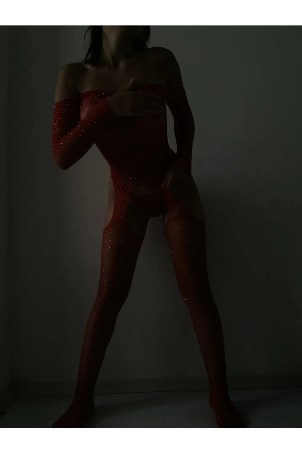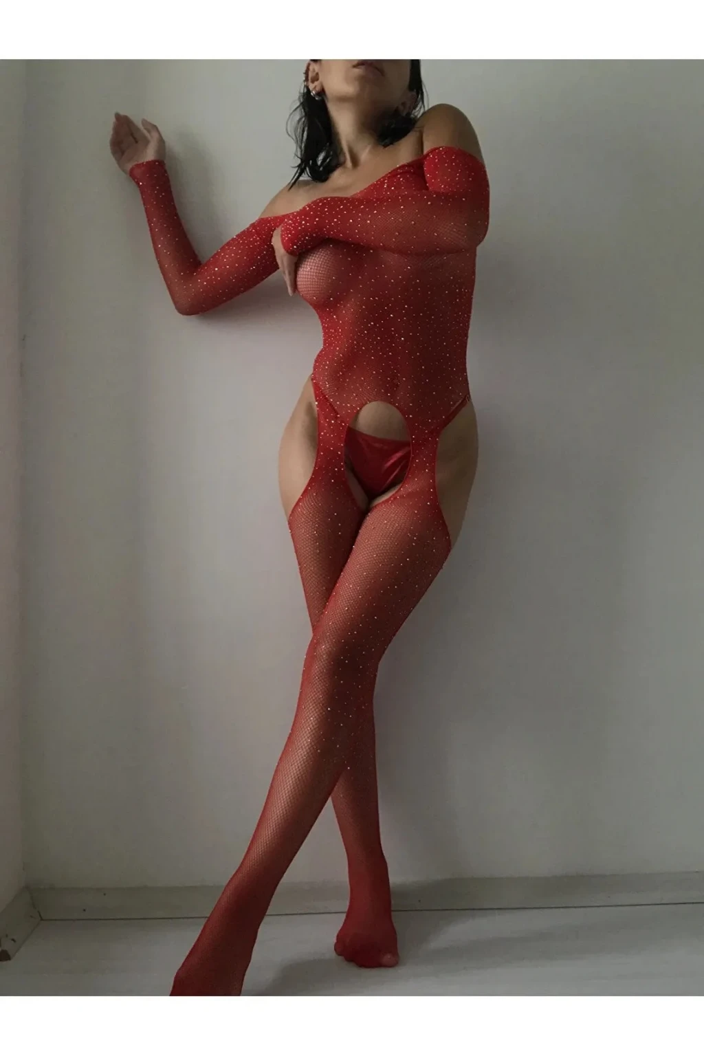 Kadın Özel Bölgesi Açık Kırmızı Fantezi Taşlı Vücut Çorabı
