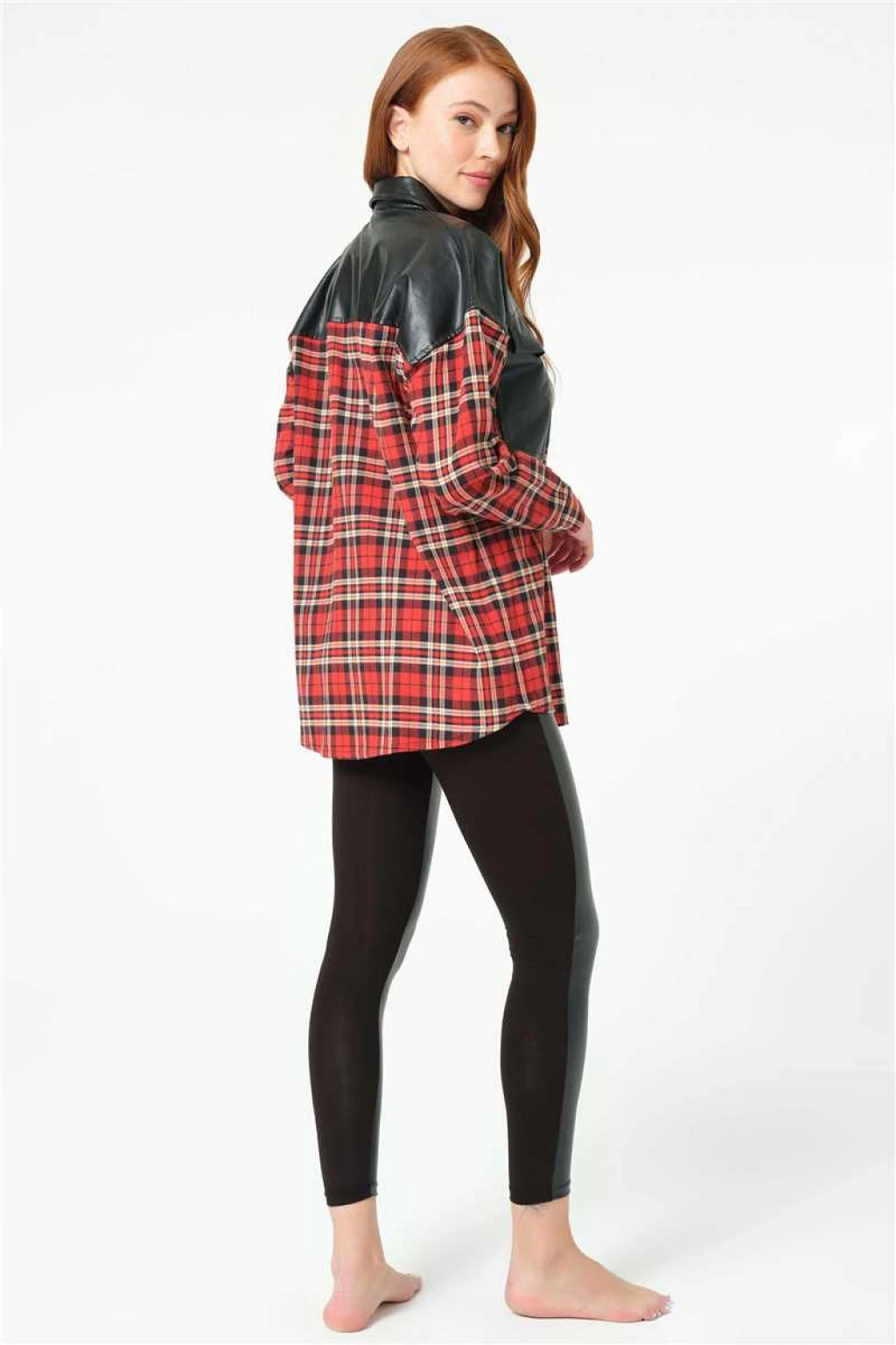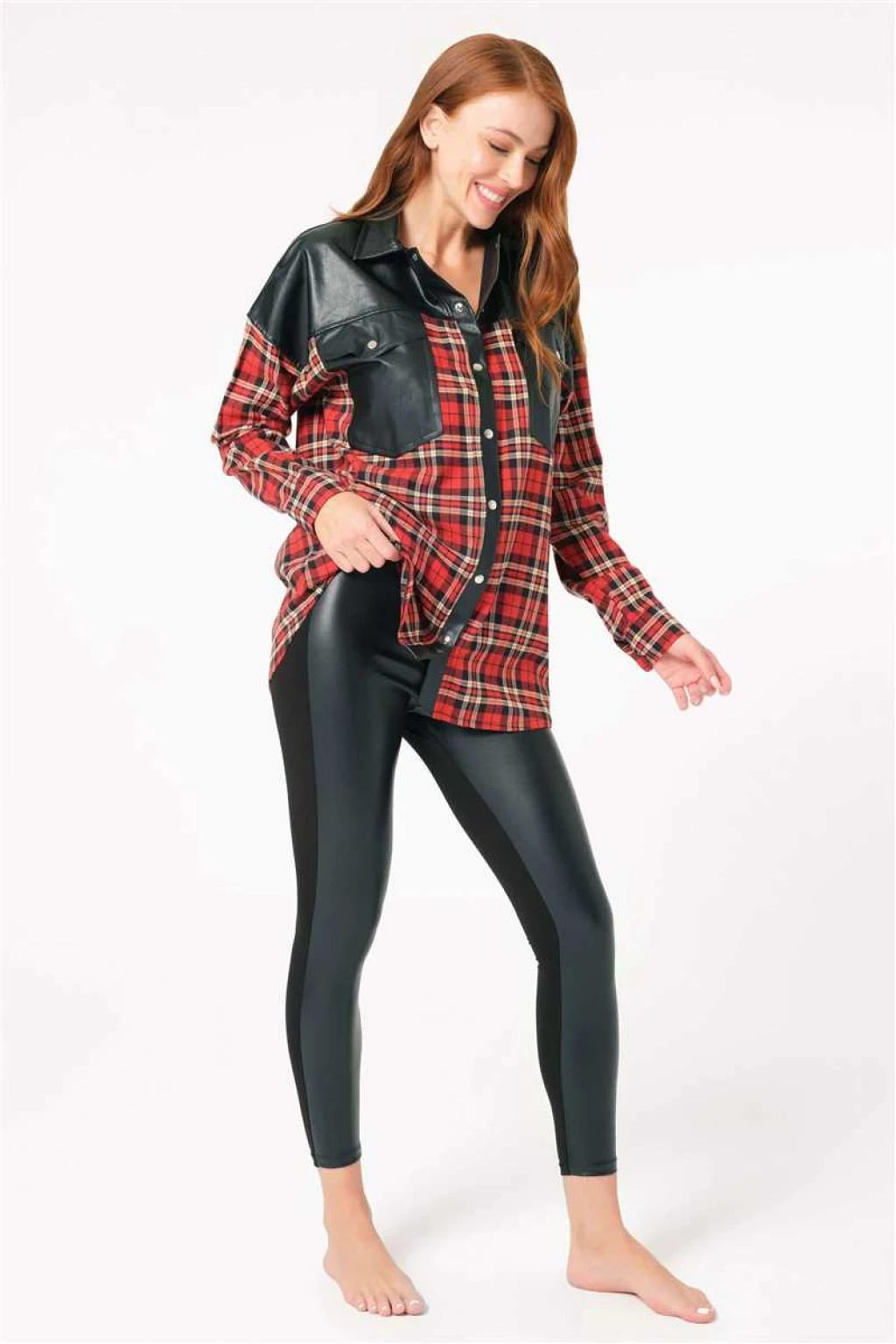 Kısa Ad:Kadın Pamuklu Ekose Çıtçıtlı Uzun Kol Cepli Gömlek ve Deri Görünümlü Tayt Takım (9762)