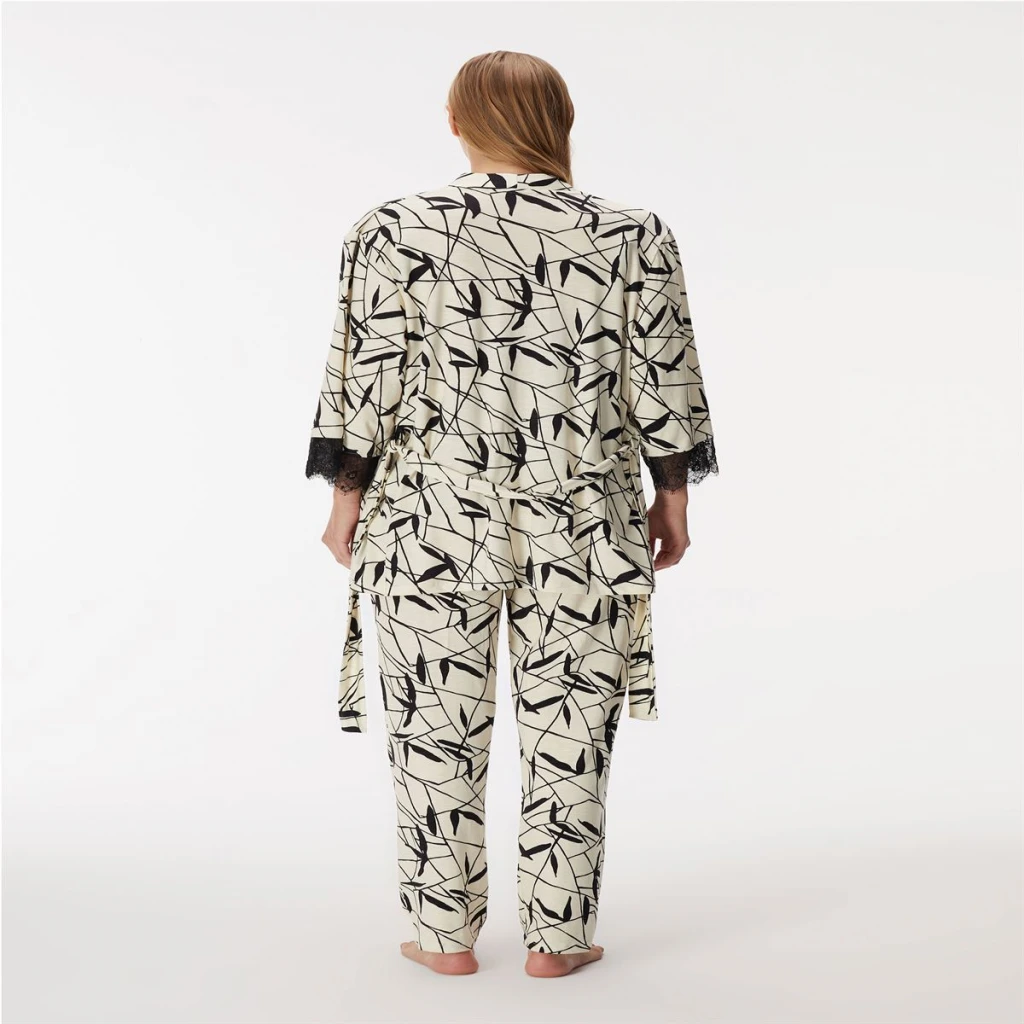 Kadın Viskon Hamile Lohusa Dantelli Sabahlık Önden Açılan Emzirme T-shirt Ve Pantolon Pijama 3'lü Takım