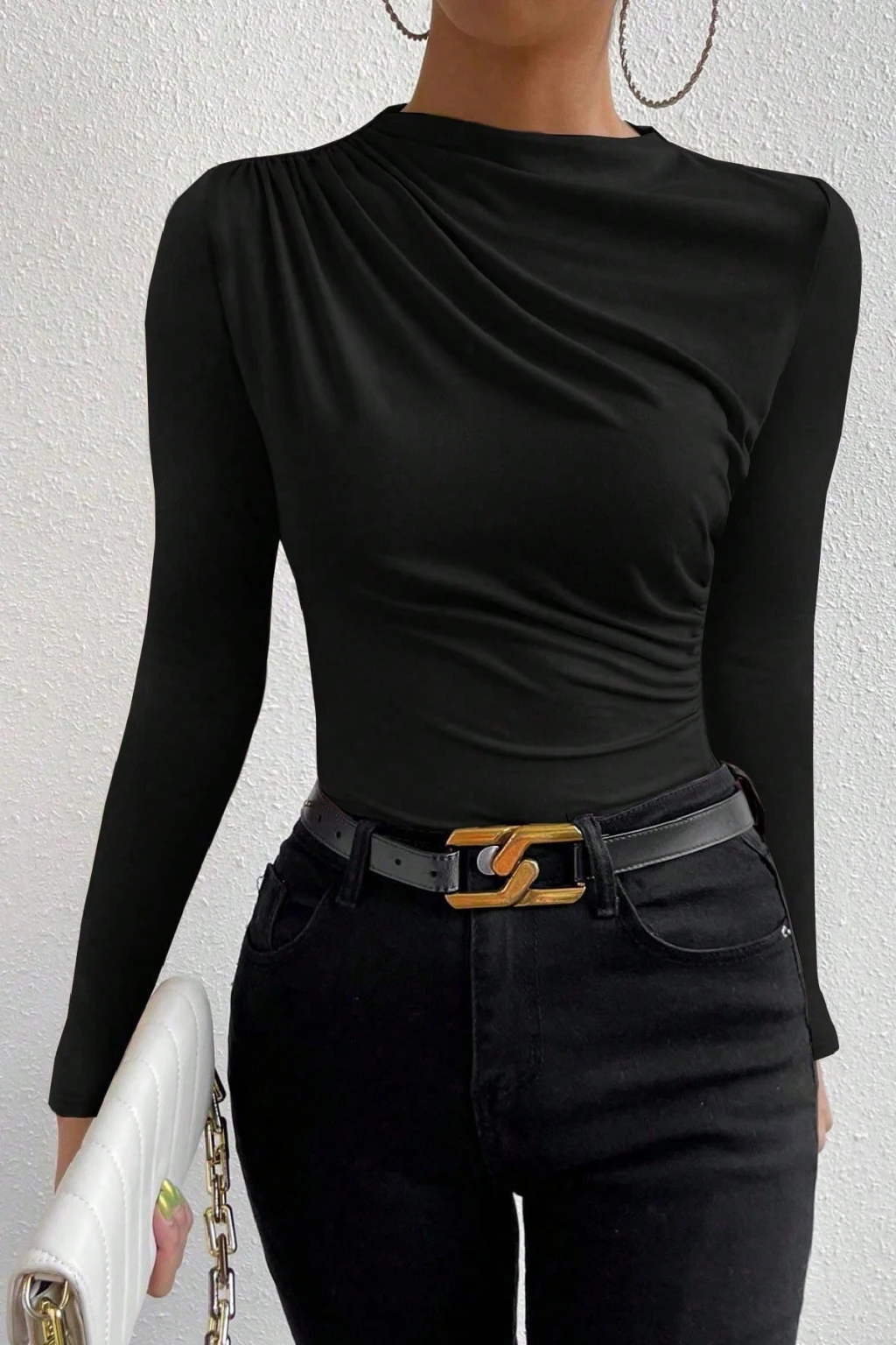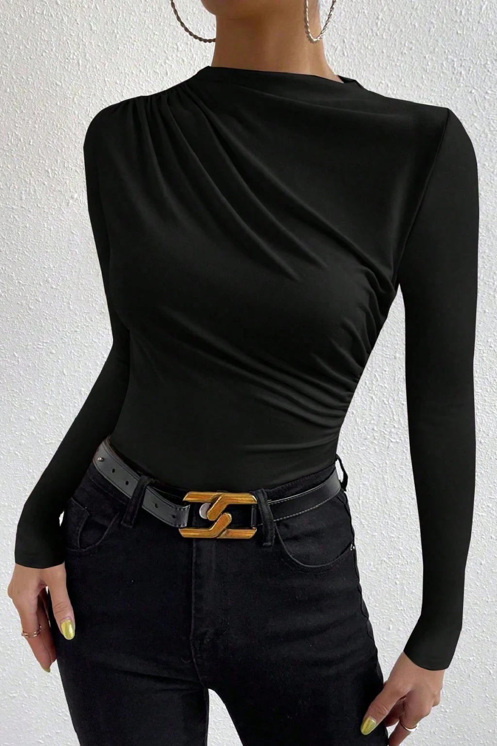 • Yaka Tipi: Hafif asimetrik, büzgü detaylı