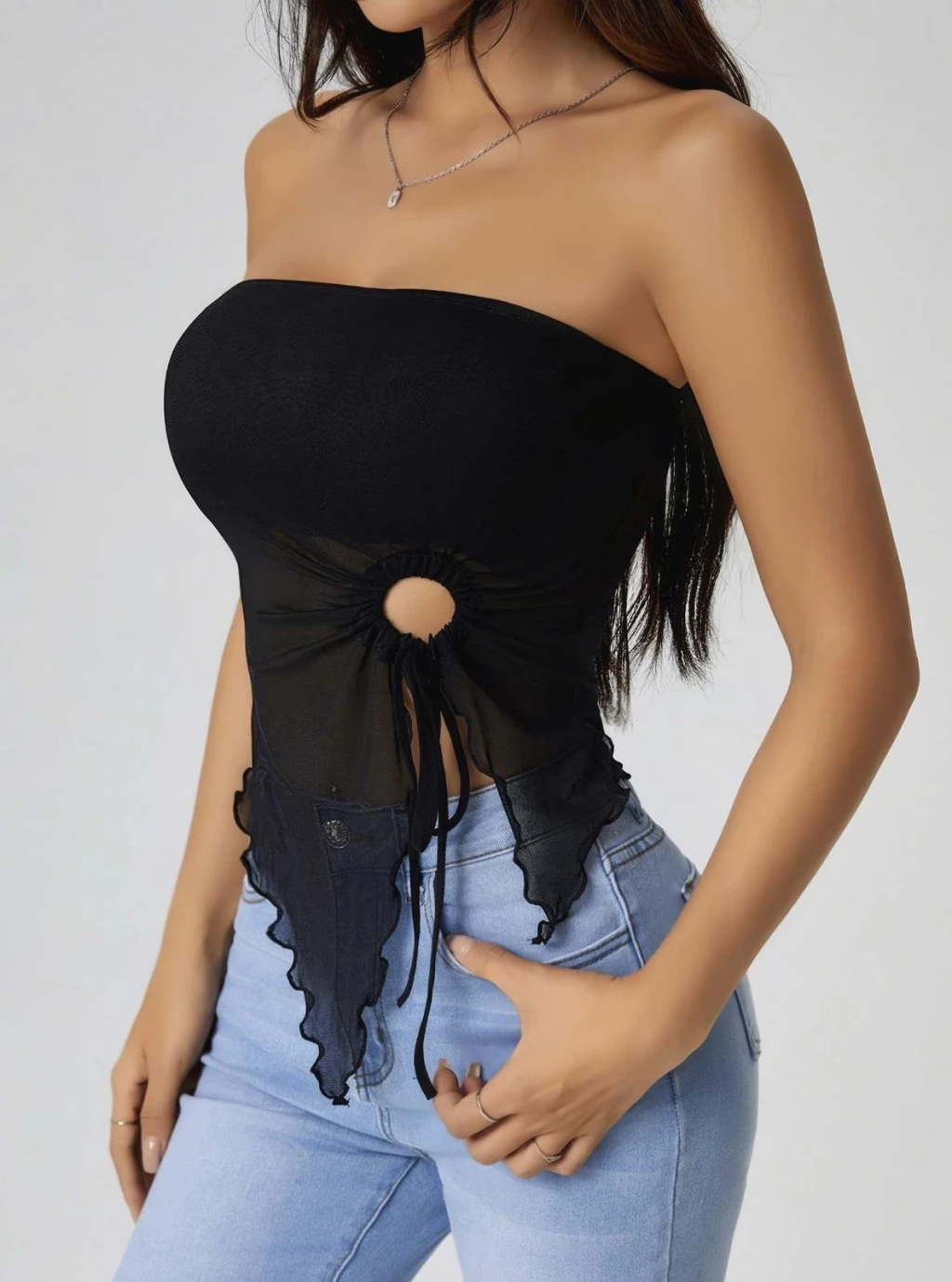 Kadın Siyah Crop Askılı Önden Bağlama Fırfır Detaylı 5089